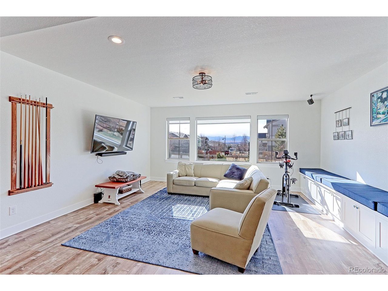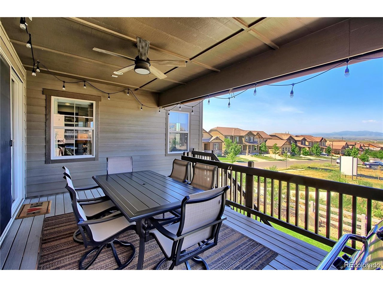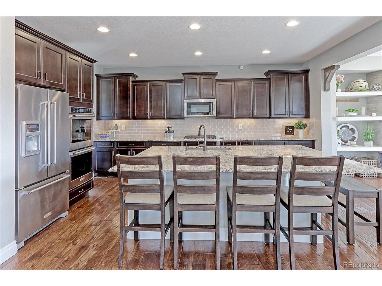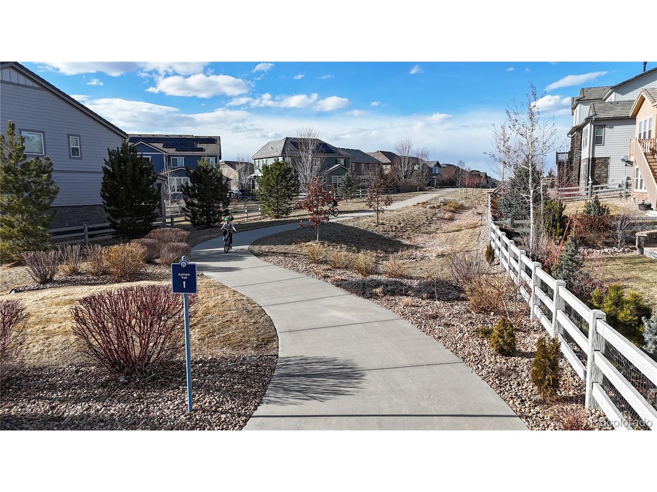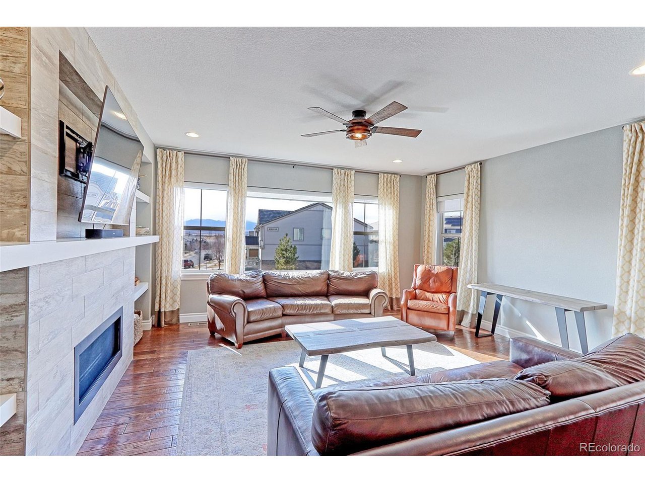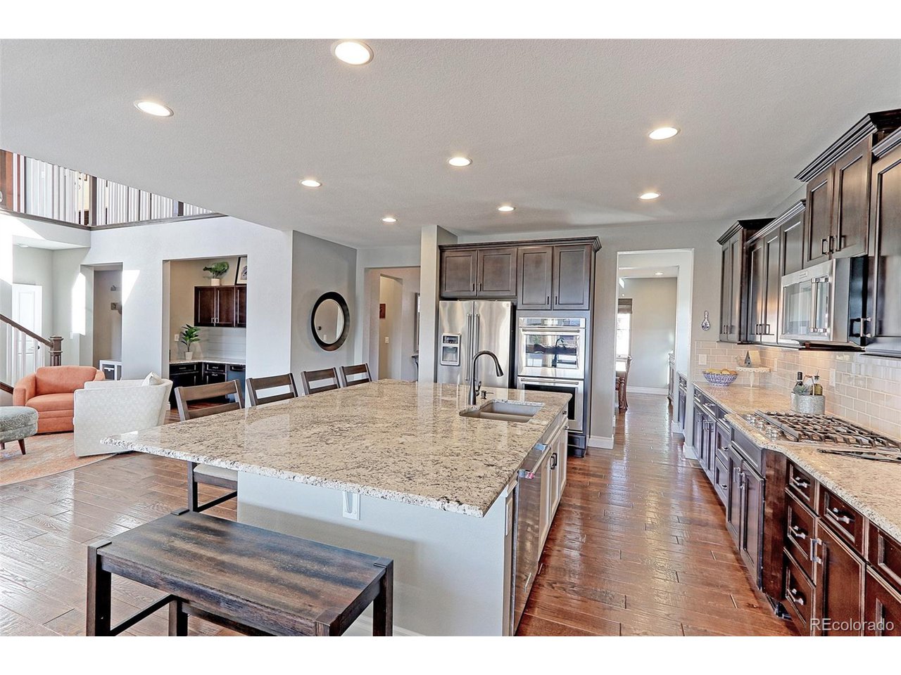 Welcome to 15955 Humboldt Peak Dr, a stunning corner lot home in Broomfield, offering breathtaking mountain views and mature landscaping. This meticulously crafted home combines style and functionality with a thoughtfully designed layout, perfect for entertaining. The gourmet kitchen features slab granite countertops, subway tile backsplash, KitchenAid stainless steel appliances, and a large island with seating. Additional highlights include a walk-in pantry, a butler's pantry, and a cozy breakfast nook. A mudroom with custom-built-ins off the 3-car garage provides organization with a convenient drop zone. The main floor includes a study with barn doors and views. Cozy up in the family room with a Cosmo gas fireplace, great for relaxing or hosting guests. The formal dining room and a keeping room with soaring ceilings offer ample space for gatherings, while the keeping room flows into a covered deck with mountain views, perfect for indoor/outdoor entertaining. A built-in desk with shiplap accents adds charm and functionality. Upstairs, the primary suite boasts a gridded ceiling, mountain views, and a spa-like 4-piece en-suite bath with dual vanities, large shower, and custom his-and-her walk-in closets. A guest suite with a shiplap accent wall and private en-suite bath, plus a loft, laundry room, two additional bedrooms, and another full bathroom complete the upper level. The finished walk-out basement is an entertainer's dream, with a wet bar featuring a beverage fridge, a flex space with views, a gaming area, built-in storage, a bedroom, and a 3/4 bath. The large backyard backs to a walking trail and offers a covered patio with sunshades, hot tub, gas fire pit, and gas grill. A custom gate on both the front and back porches adds convenience. Fresh exterior paint was applied in 2024! Community amenities include parks, walking trails, and a pool/clubhouse. Located with easy access to Boulder, DIA, and Denver, this home is the perfect blend of luxury and convenience.