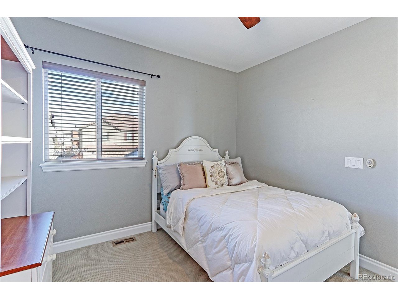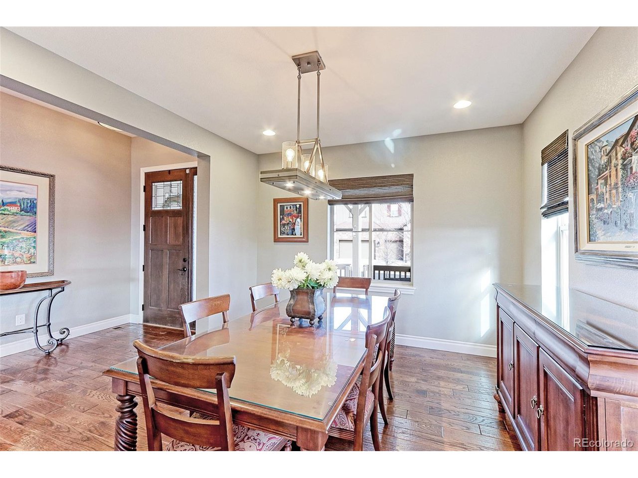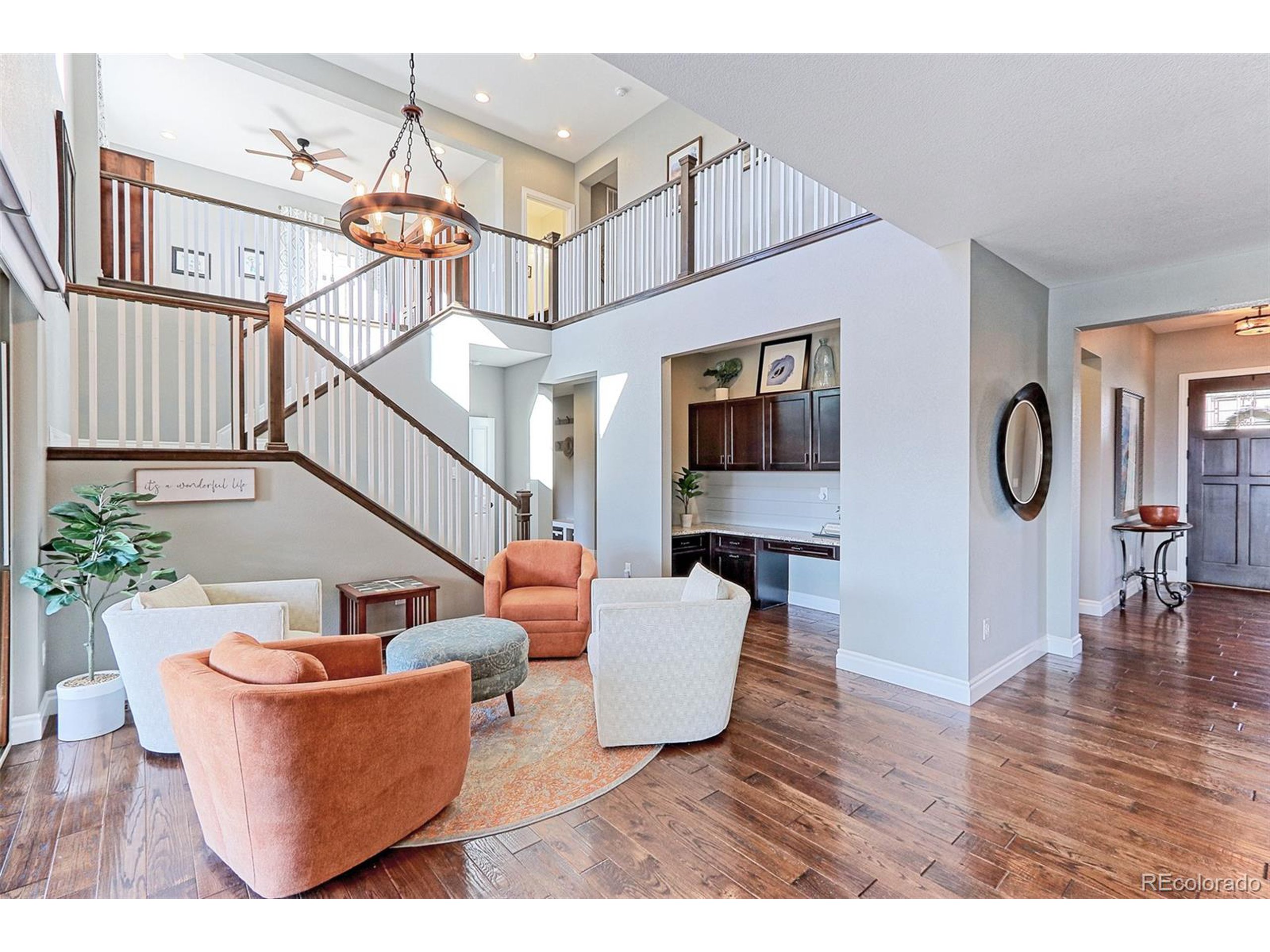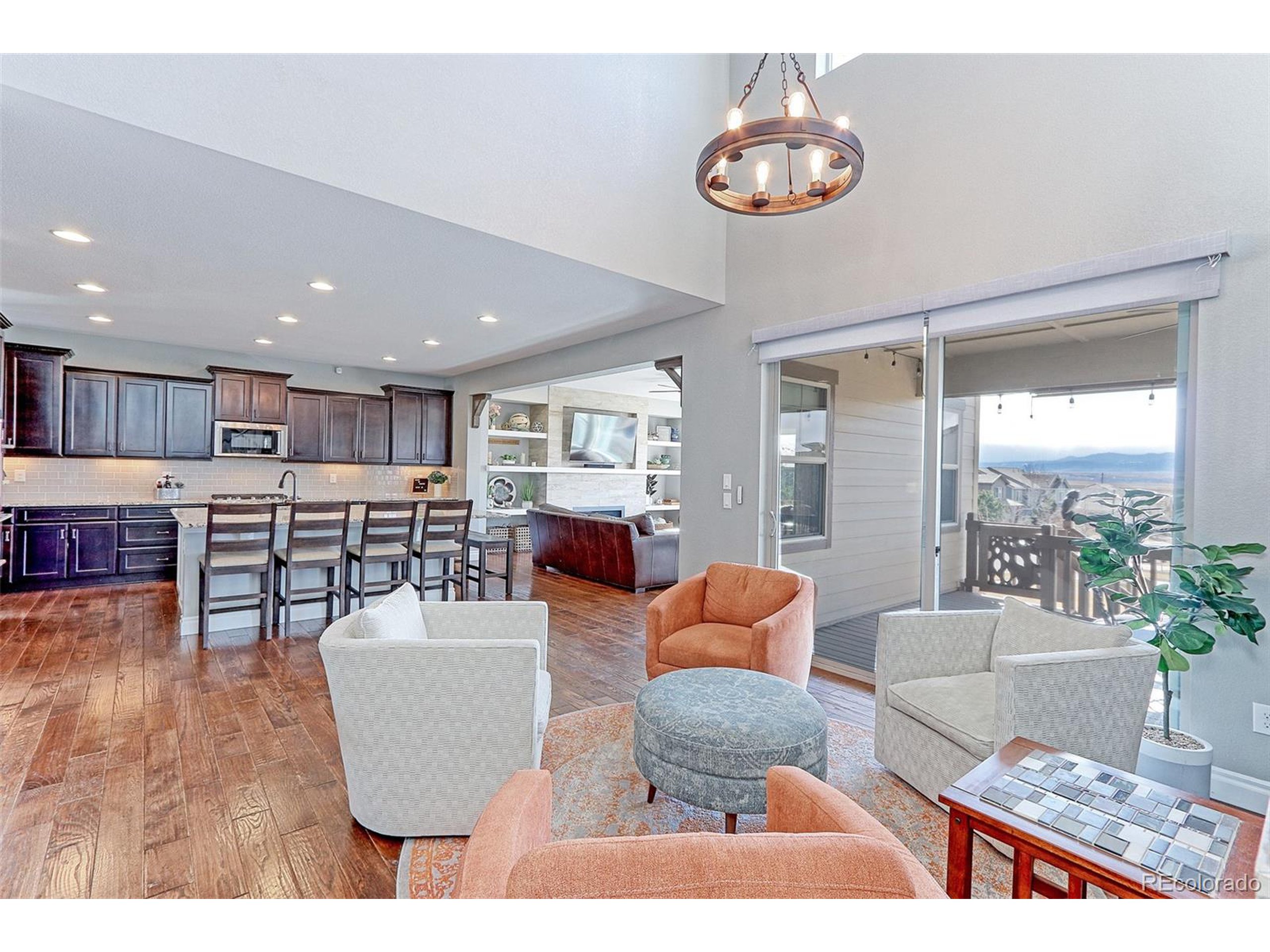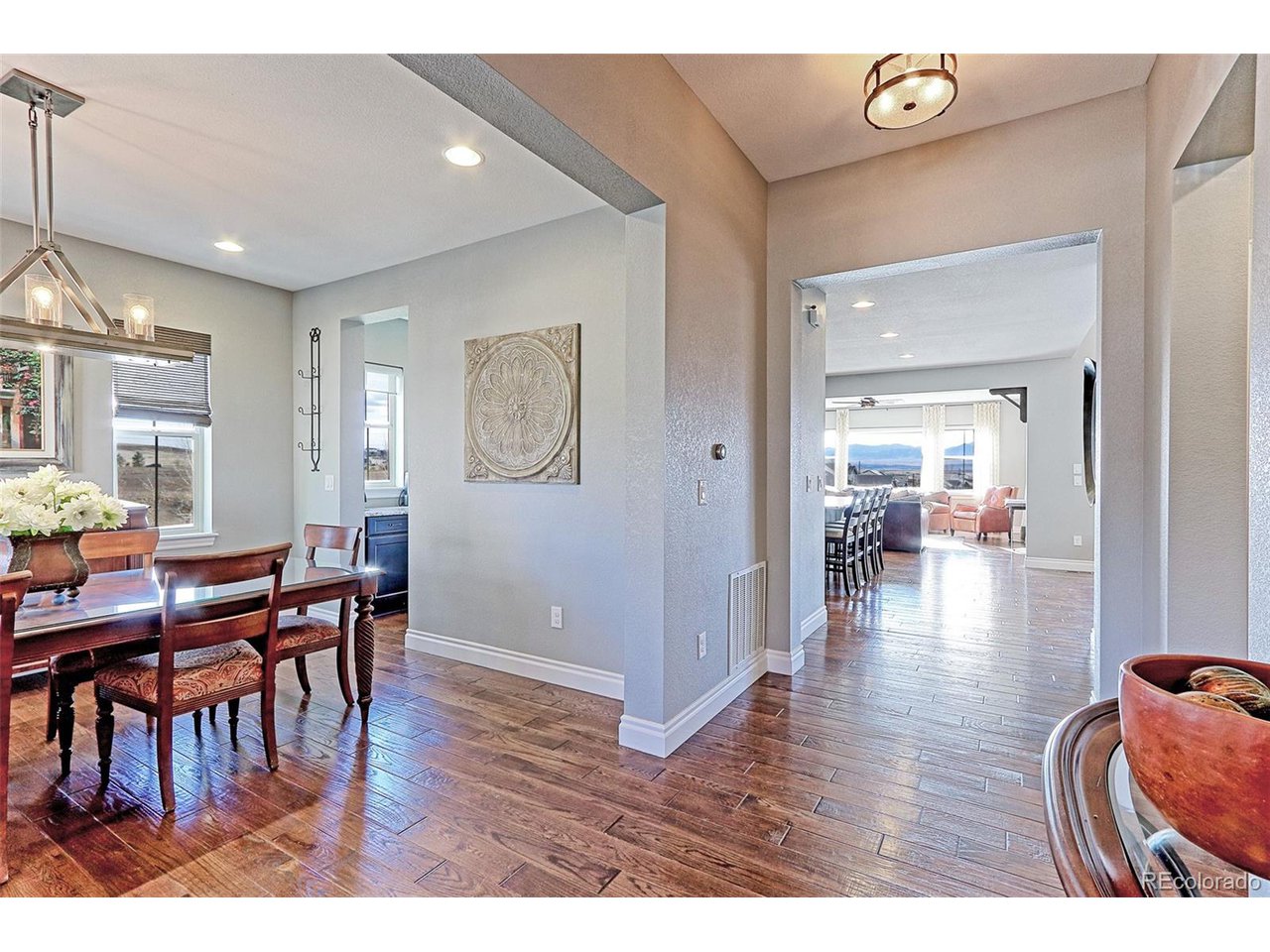 Welcome to 15955 Humboldt Peak Dr, a stunning corner lot home in Broomfield, offering breathtaking mountain views and mature landscaping. This meticulously crafted home combines style and functionality with a thoughtfully designed layout, perfect for entertaining. The gourmet kitchen features slab granite countertops, subway tile backsplash, KitchenAid stainless steel appliances, and a large island with seating. Additional highlights include a walk-in pantry, a butler's pantry, and a cozy breakfast nook. A mudroom with custom-built-ins off the 3-car garage provides organization with a convenient drop zone. The main floor includes a study with barn doors and views. Cozy up in the family room with a Cosmo gas fireplace, great for relaxing or hosting guests. The formal dining room and a keeping room with soaring ceilings offer ample space for gatherings, while the keeping room flows into a covered deck with mountain views, perfect for indoor/outdoor entertaining. A built-in desk with shiplap accents adds charm and functionality. Upstairs, the primary suite boasts a gridded ceiling, mountain views, and a spa-like 4-piece en-suite bath with dual vanities, large shower, and custom his-and-her walk-in closets. A guest suite with a shiplap accent wall and private en-suite bath, plus a loft, laundry room, two additional bedrooms, and another full bathroom complete the upper level. The finished walk-out basement is an entertainer's dream, with a wet bar featuring a beverage fridge, a flex space with views, a gaming area, built-in storage, a bedroom, and a 3/4 bath. The large backyard backs to a walking trail and offers a covered patio with sunshades, hot tub, gas fire pit, and gas grill. A custom gate on both the front and back porches adds convenience. Fresh exterior paint was applied in 2024! Community amenities include parks, walking trails, and a pool/clubhouse. Located with easy access to Boulder, DIA, and Denver, this home is the perfect blend of luxury and convenience.