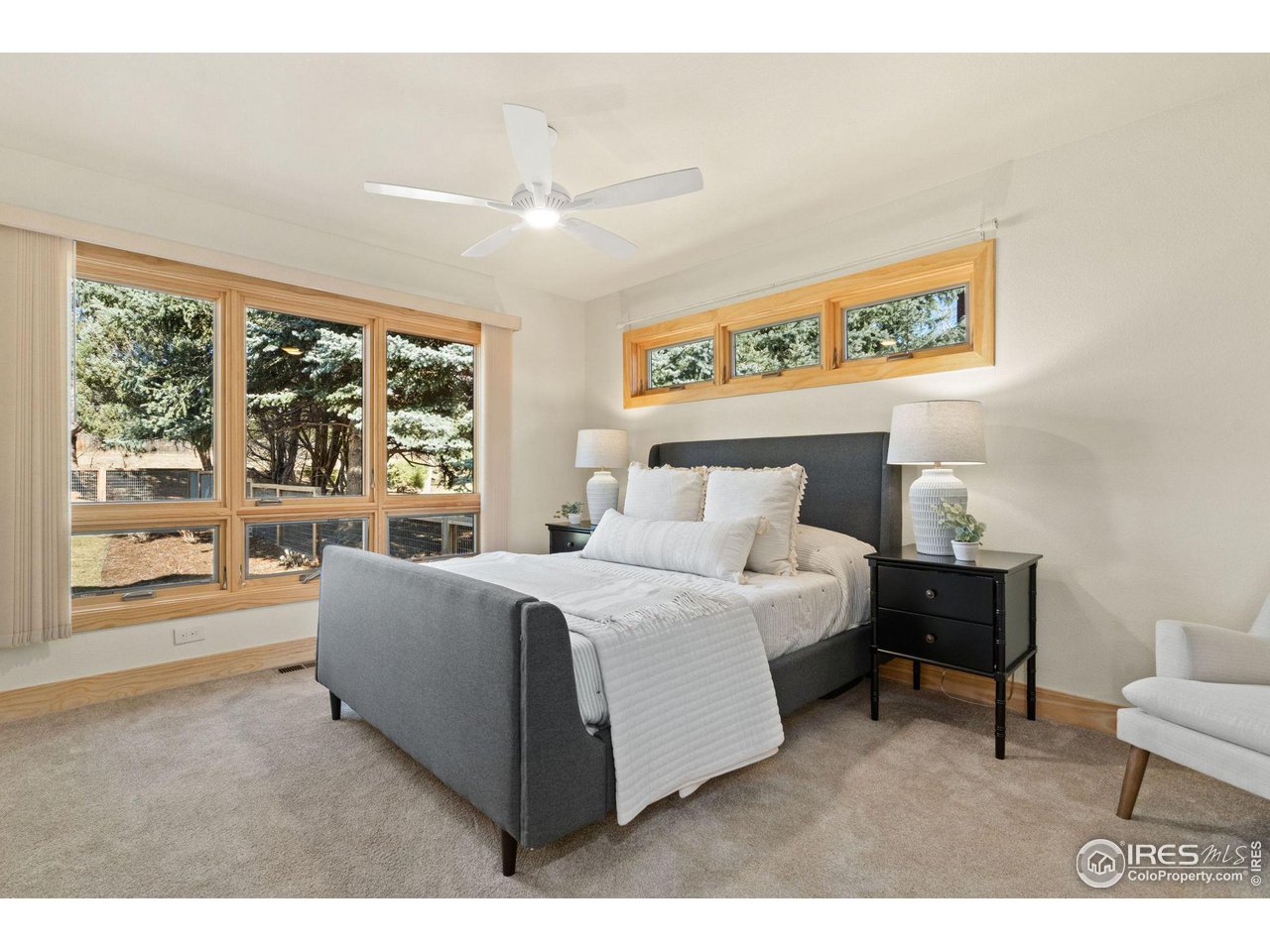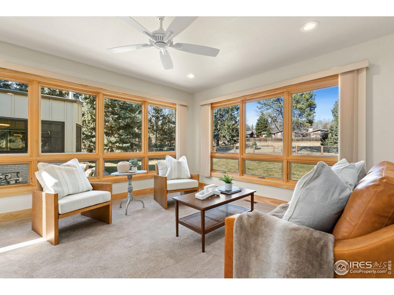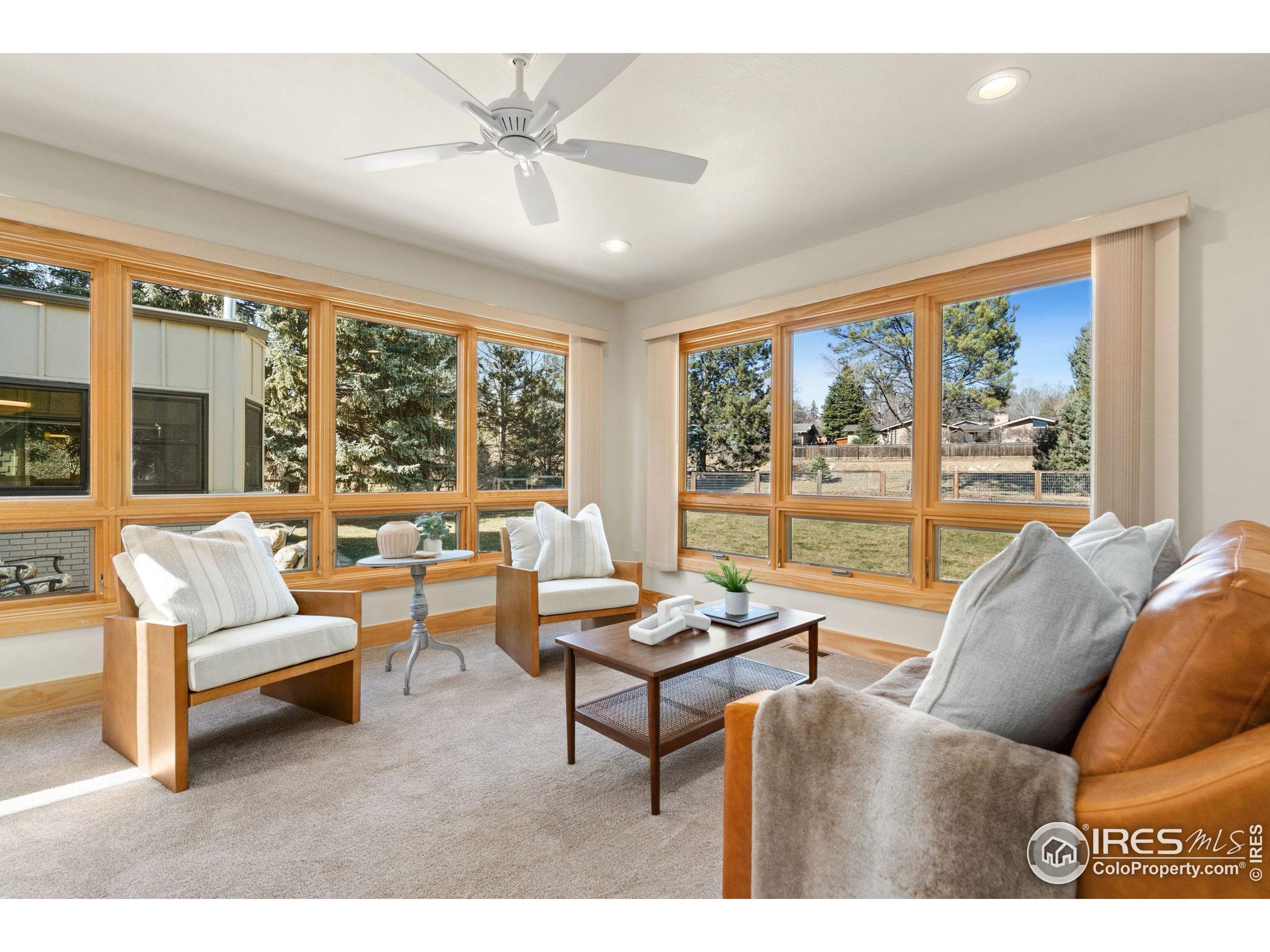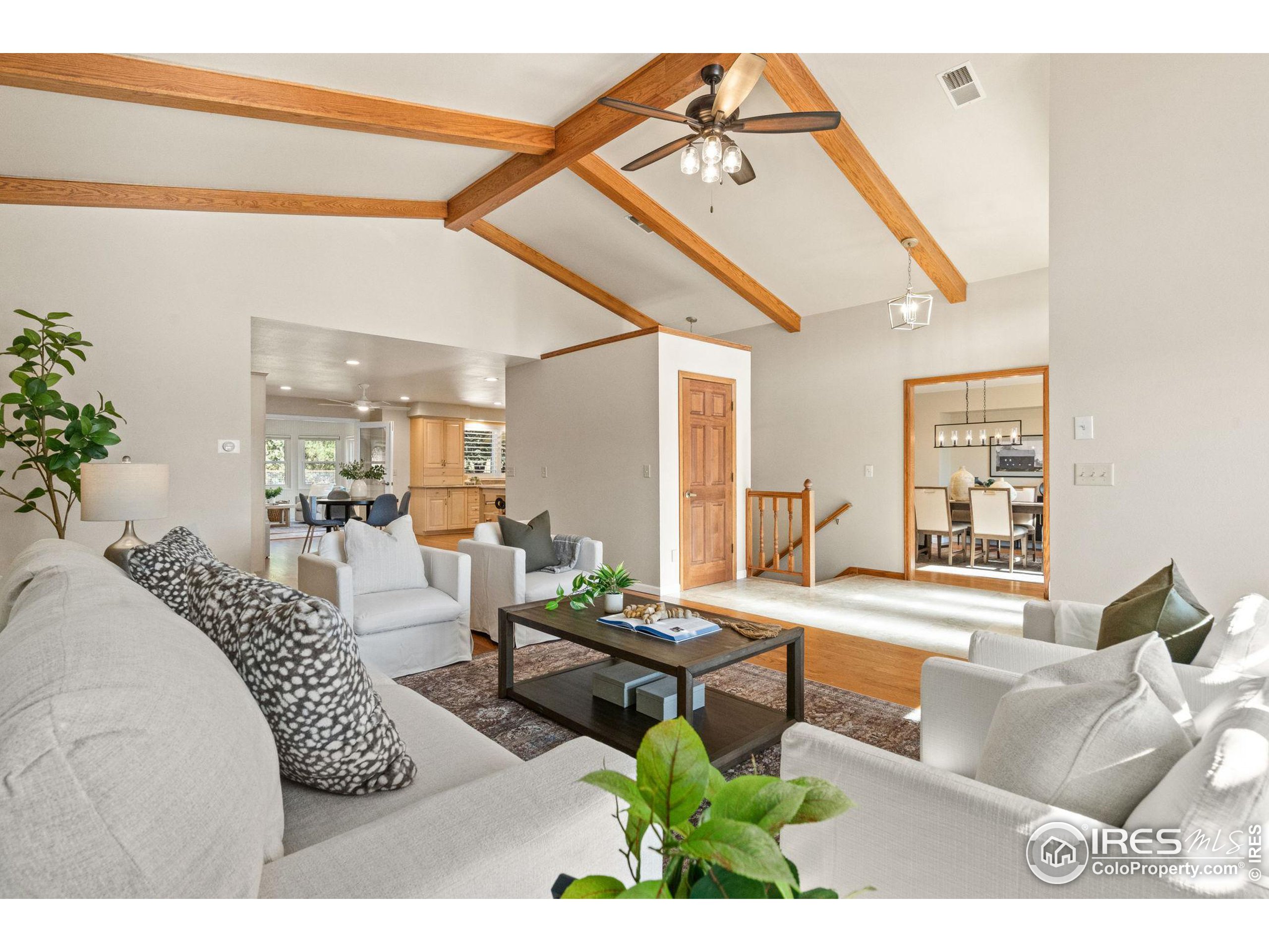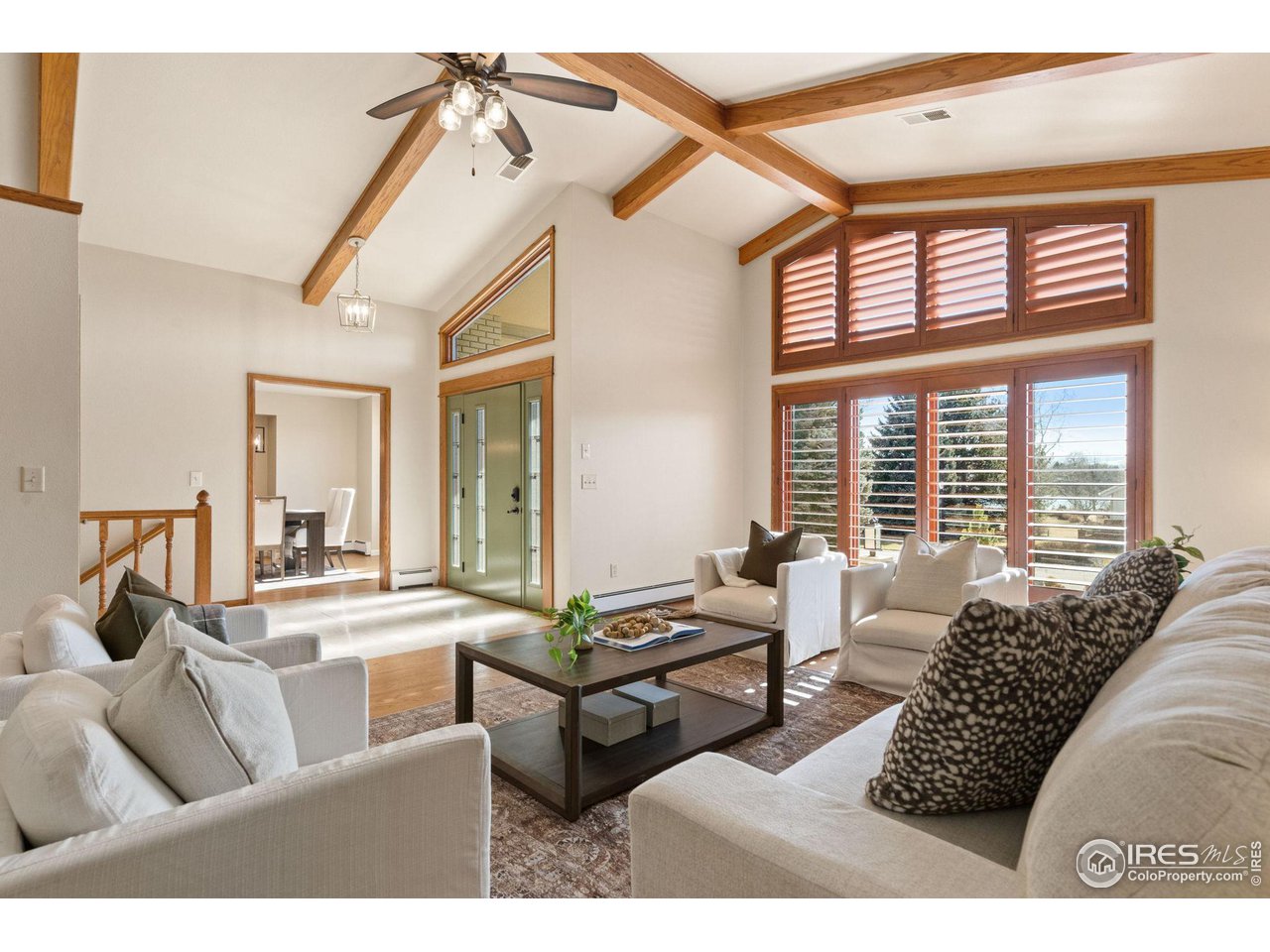 Beautifully updated & fabulously improved home in the heart of the desirable Linden Lake with views of Longs Peak, Horsetooth, and a little bit of the lake too! This charming home backs to green space and the canal and offers peaceful privacy for not only the primary residents but anyone that is fortunate enough to occupy the newly built connected apartment home w/private entrance for your family. From the moment you enter the circular drive & pass the courtyard you'll be welcomed into an open & inviting home featuring vaulted beamed ceilings, rich wood flrs, large windows to let you take in the views of the mountains and lake, and a private dining rm that makes entertaining a breeze. Huge kitchen complete w/an oversized island, professional appliances including a SubZero refrigerator, Wolf oven, Wolf microwave, Wolf warming drawer & Viking Cooktop. Endless cabinet space, wine storage, desk area, & large walk-in pantry. Adorable sunroom that you'll never want to leave complete w/gas stove & white paneled walls. The primary retreat offers a sitting area, fully remodeled spa bath complete w/4 shower heads, and a large private office or workout room. Rounding out the main floor you'll have direct access to the beautifully built ranch style apartment which shares a generous mud room & separate laundry area complete w/sink and storage. The apartment offers a separate parking area, radiant heat, efficient kitchen w/custom cabinetry, granite counters, wide plank wood floors, generous living room surrounded by windows and double doors to the patio. Finished garden level basement offers a rec room w/stone fireplace & wet bar, 2 spacious bdrms, a full bath w/double sinks, lg bonus room w/double doors and Murphy bed and 2-large storage rooms. Large yard w/new fence offers lush landscaping, mature trees, paver patio & composite deck, private hot tub area w/direct access into the primary suite, and a storage shed. Situated directly across from a neighborhood lake access point.