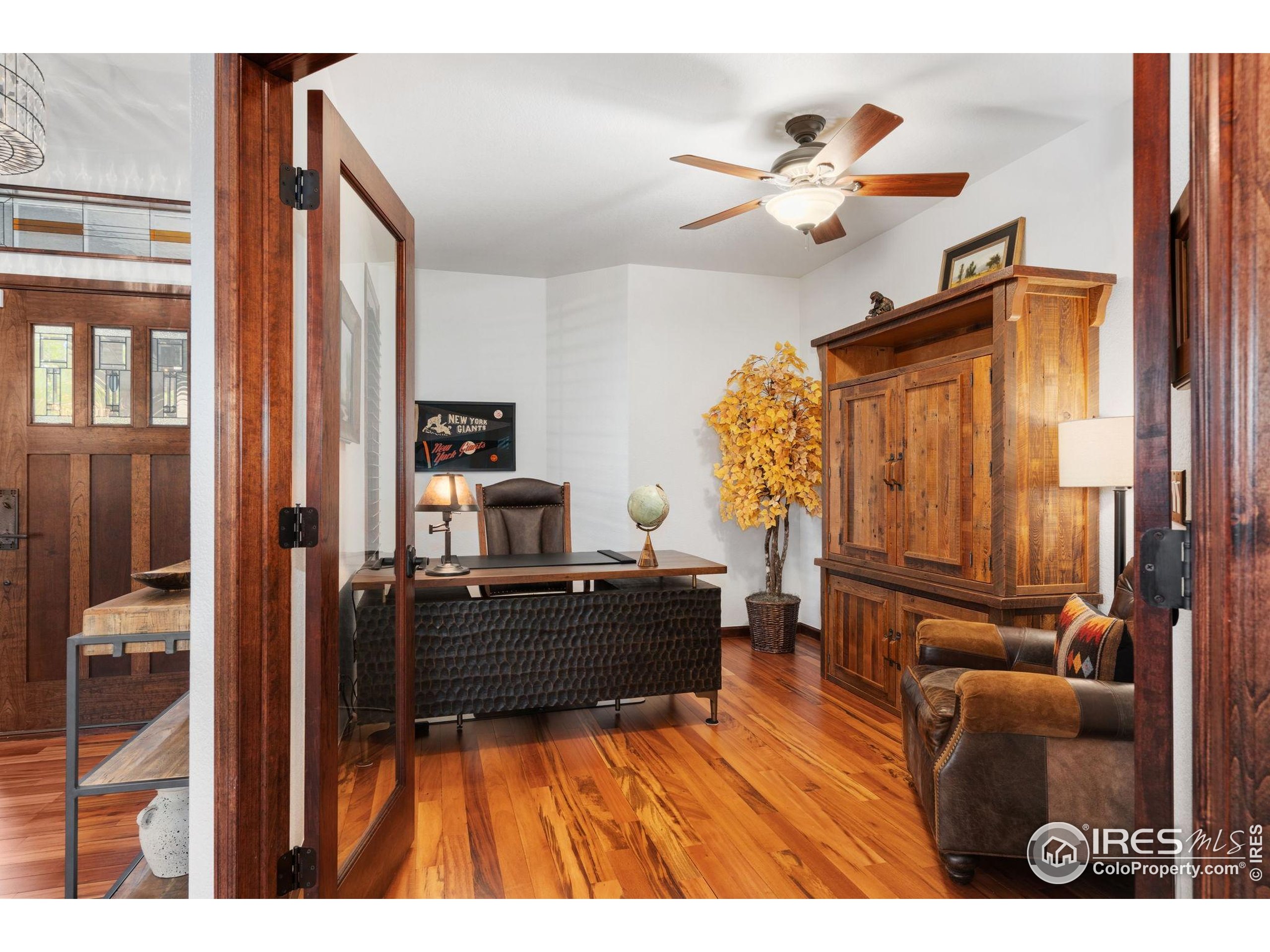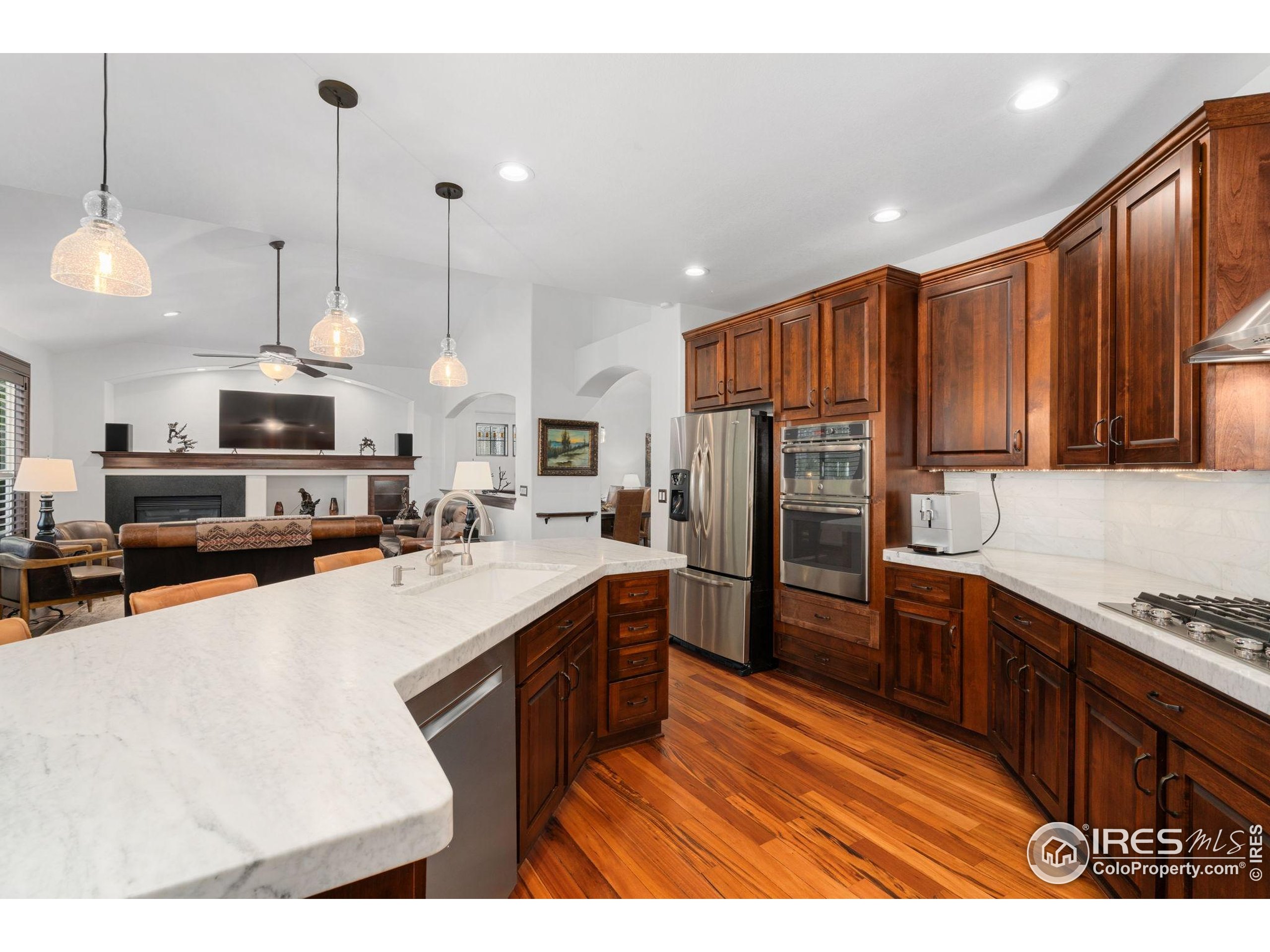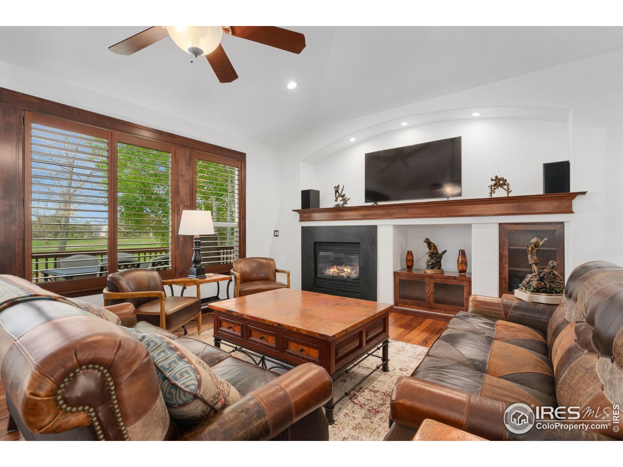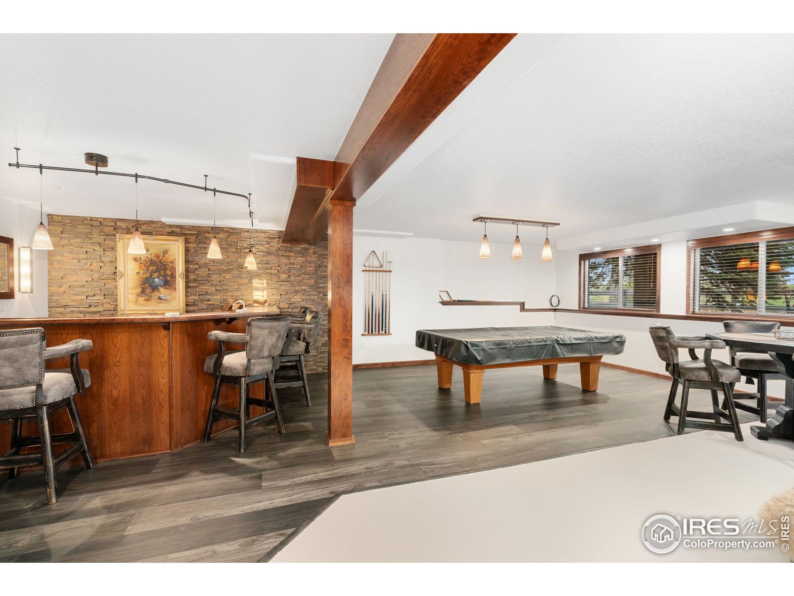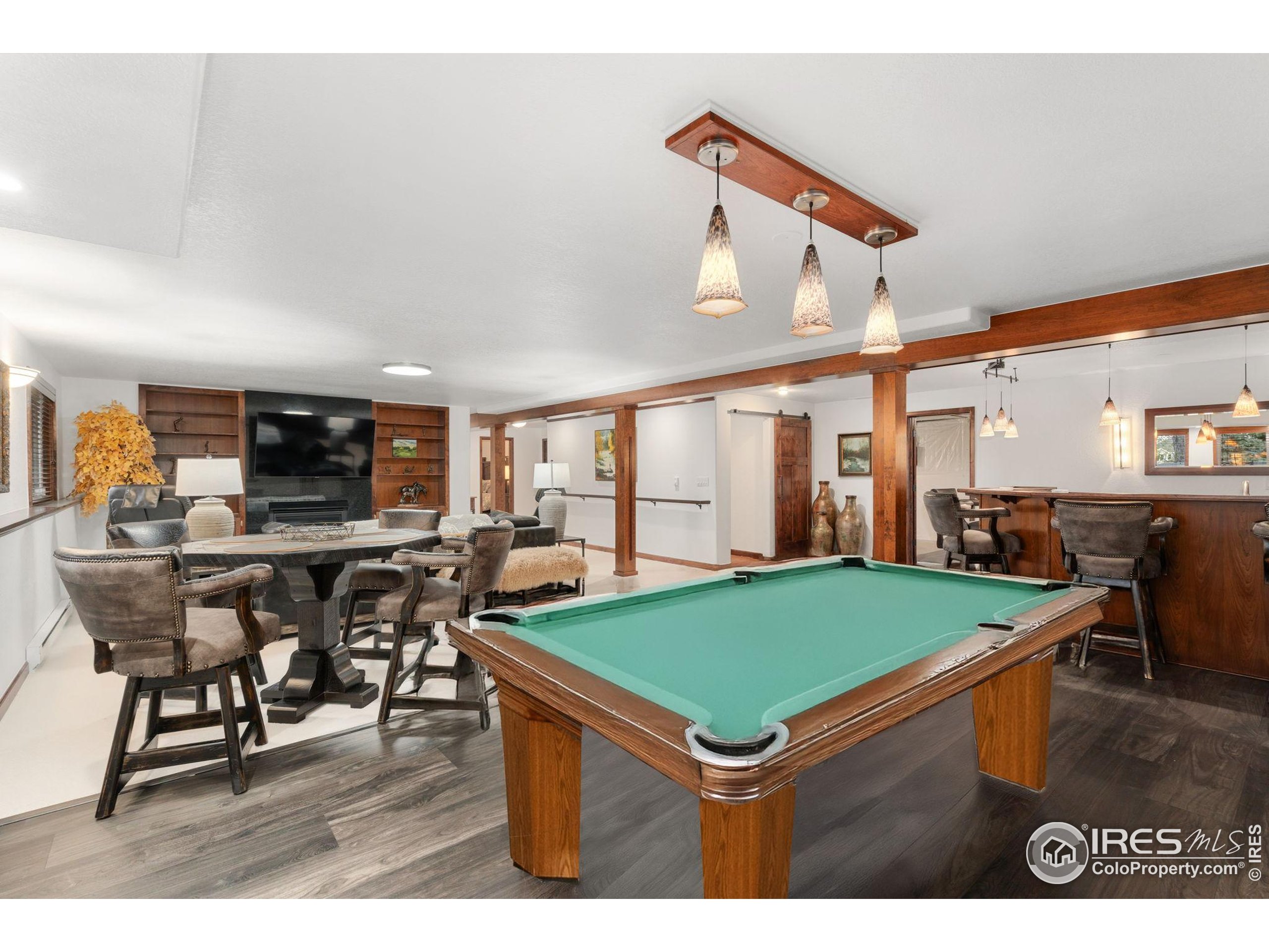 Welcome to 4283 Golf Vista Dr, a stunning and meticulously maintained ranch-style home backing to the 13th Fairway of the Mariana Butte Golf Course. This beautifully appointed 4-bedroom, 3-bathroom residence with a spacious 3-car garage offers the perfect blend of luxury, comfort, and exceptional golf course living. Brazilian tigerwood floors span the main level, complemented by soaring ceilings, custom iron rails, and expansive windows that fill the space with natural light. The home opens to a bright and elegant living room and formal dining room, perfect for entertaining and everyday enjoyment. The chef's kitchen features rich cherry cabinetry, marble countertops, under-cabinet lighting, and a large island with wrap-around seating. It also includes a casual eat-in area for everyday dining and opens directly to the back deck. Adjacent to the kitchen is a cozy family room with a striking leathered granite fireplace-creating a warm and inviting space for relaxation and connection. The expansive primary suite is a serene retreat with sliding doors to the back deck, dual walk-in closets, and a luxurious en-suite bathroom. This spa-like space boasts marble floors, cherry cabinets, a double vanity, a dramatic black tile accent wall, and a walk-in, low profile entry shower. The main floor also includes a second bedroom, an office, a charming 3/4 bathroom, and an updated laundry room with new cabinetry and quartz countertops. The garden-level basement is bright and inviting with tall ceilings, Berber carpet, and plenty of natural light. It features two additional bedrooms, a flex room, a spacious rec room and game room, a second fireplace, and a fully equipped wet bar with refrigerator and built-in wine rack. A private sauna and pool table adds to the home's luxurious amenities. Outside, enjoy beautiful landscaping and peaceful fairway views from the back deck. This is Colorado living at its finest in one of Loveland's most sought-after golf course communities.
