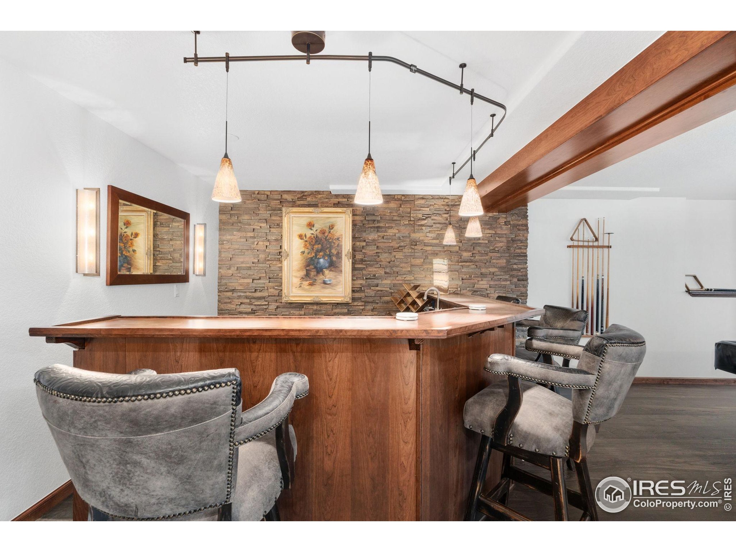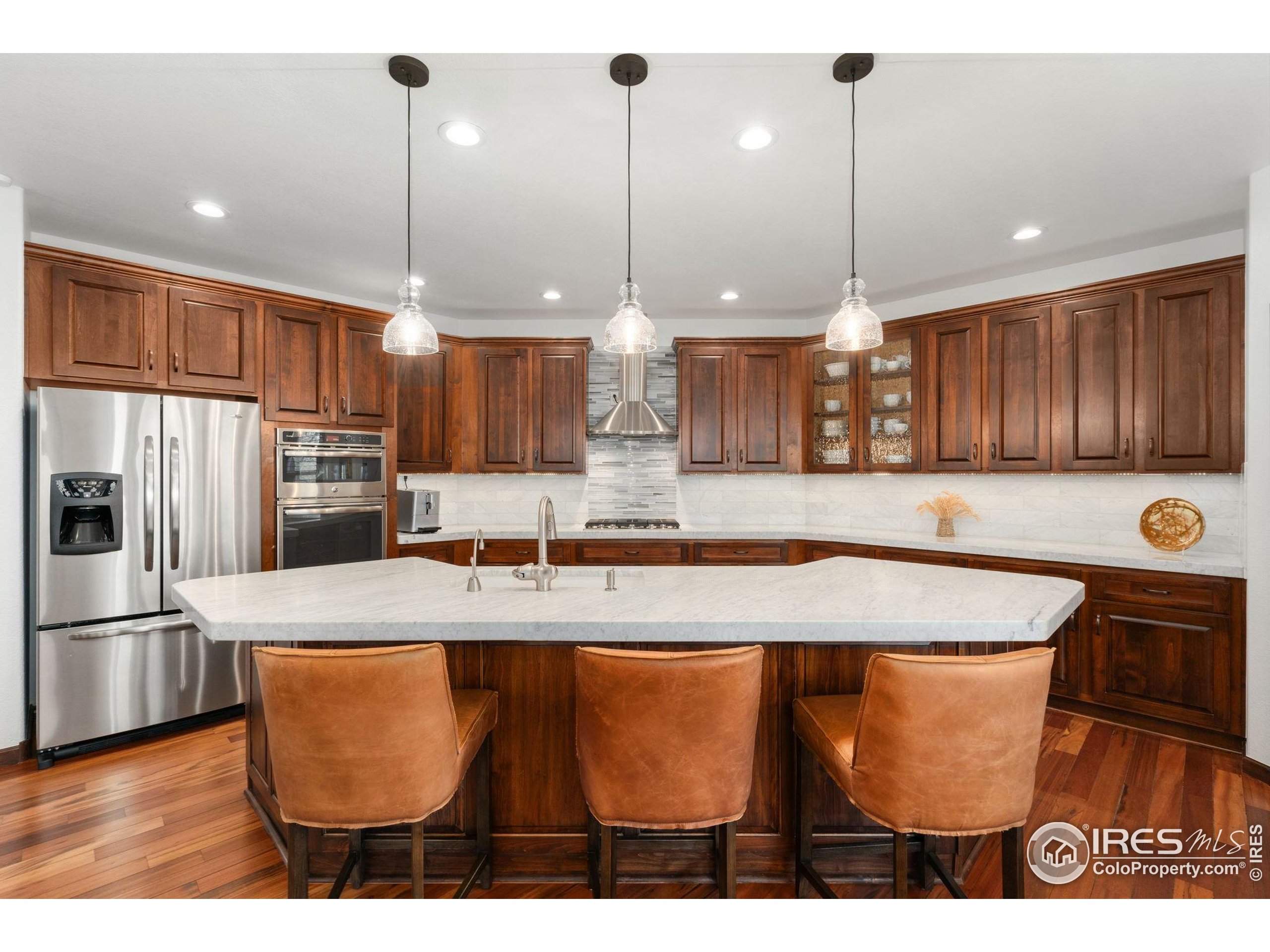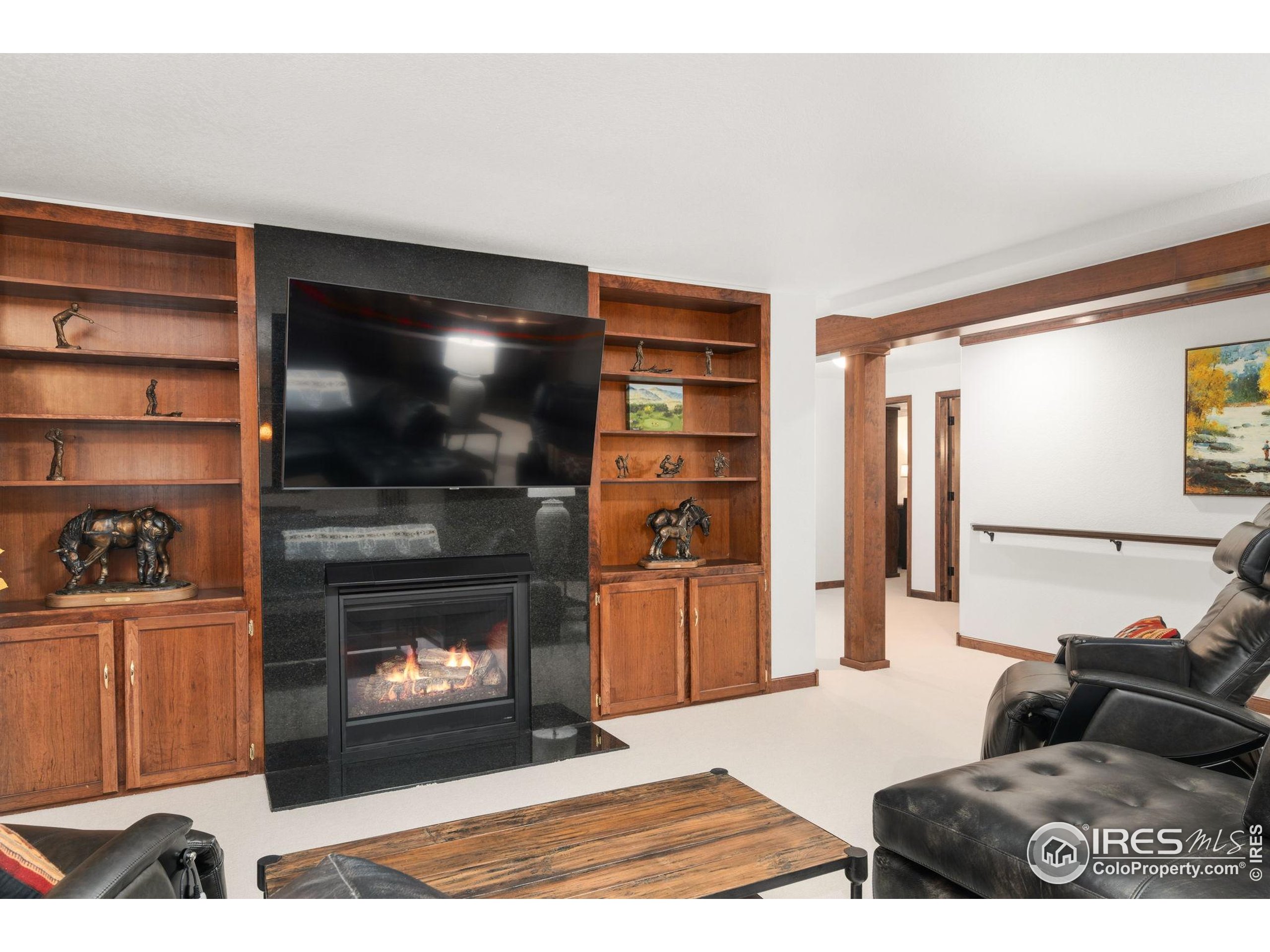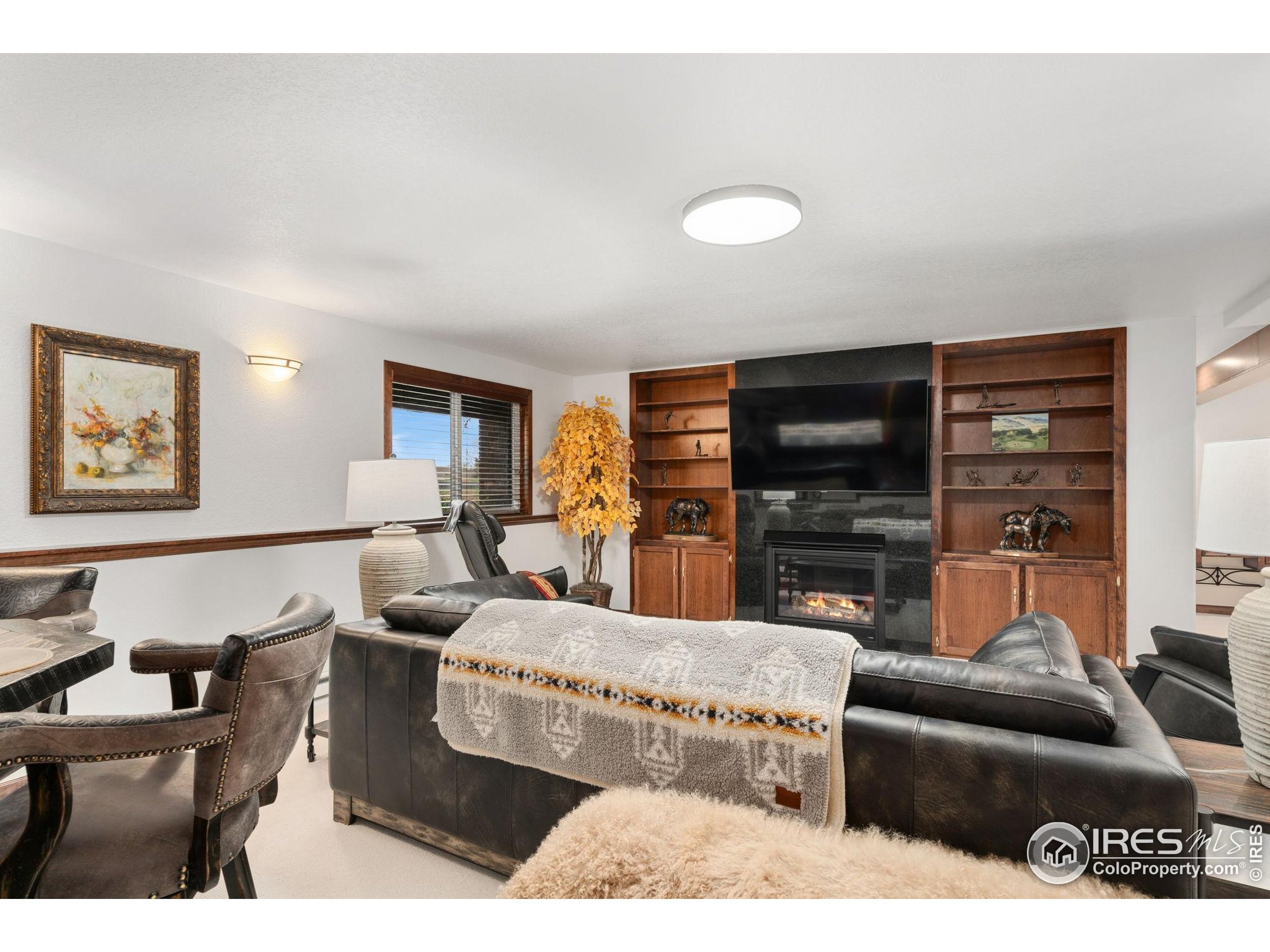 Welcome to 4283 Golf Vista Dr, a stunning and meticulously maintained ranch-style home backing to the 13th Fairway of the Mariana Butte Golf Course. This beautifully appointed 4-bedroom, 3-bathroom residence with a spacious 3-car garage offers the perfect blend of luxury, comfort, and exceptional golf course living. Brazilian tigerwood floors span the main level, complemented by soaring ceilings, custom iron rails, and expansive windows that fill the space with natural light. The home opens to a bright and elegant living room and formal dining room, perfect for entertaining and everyday enjoyment. The chef's kitchen features rich cherry cabinetry, marble countertops, under-cabinet lighting, and a large island with wrap-around seating. It also includes a casual eat-in area for everyday dining and opens directly to the back deck. Adjacent to the kitchen is a cozy family room with a striking leathered granite fireplace-creating a warm and inviting space for relaxation and connection. The expansive primary suite is a serene retreat with sliding doors to the back deck, dual walk-in closets, and a luxurious en-suite bathroom. This spa-like space boasts marble floors, cherry cabinets, a double vanity, a dramatic black tile accent wall, and a walk-in, low profile entry shower. The main floor also includes a second bedroom, an office, a charming 3/4 bathroom, and an updated laundry room with new cabinetry and quartz countertops. The garden-level basement is bright and inviting with tall ceilings, Berber carpet, and plenty of natural light. It features two additional bedrooms, a flex room, a spacious rec room and game room, a second fireplace, and a fully equipped wet bar with refrigerator and built-in wine rack. A private sauna and pool table adds to the home's luxurious amenities. Outside, enjoy beautiful landscaping and peaceful fairway views from the back deck. This is Colorado living at its finest in one of Loveland's most sought-after golf course communities.