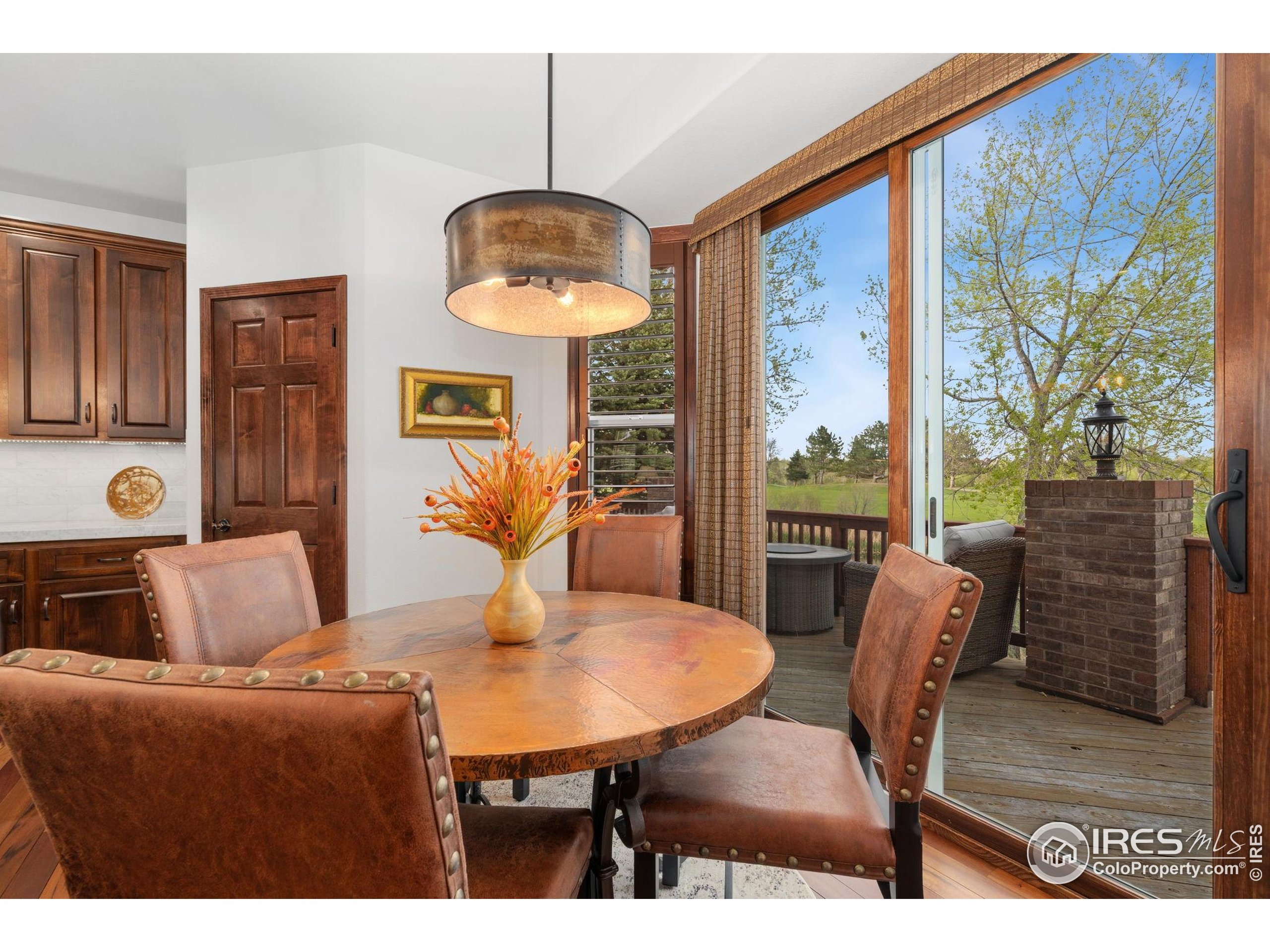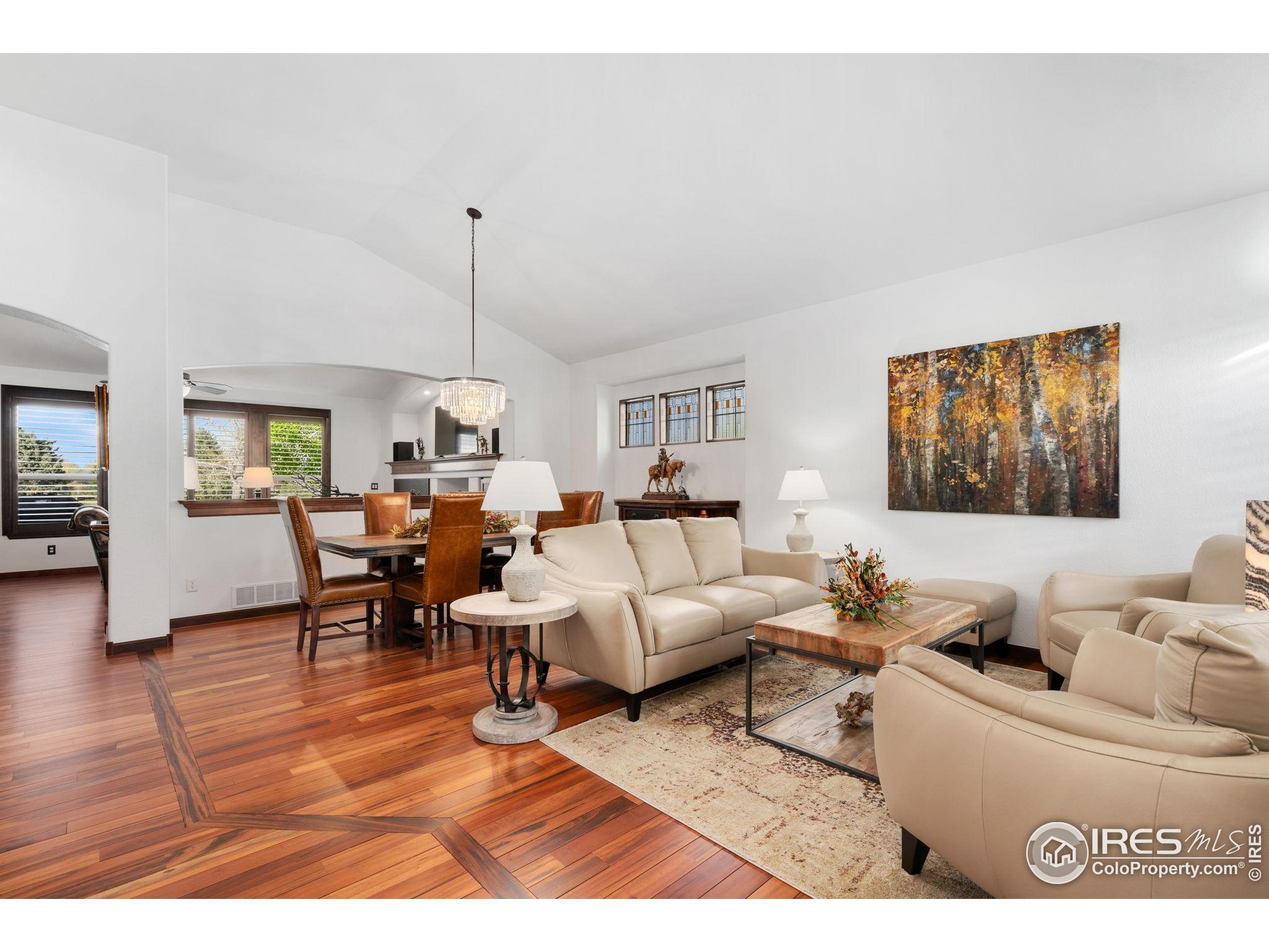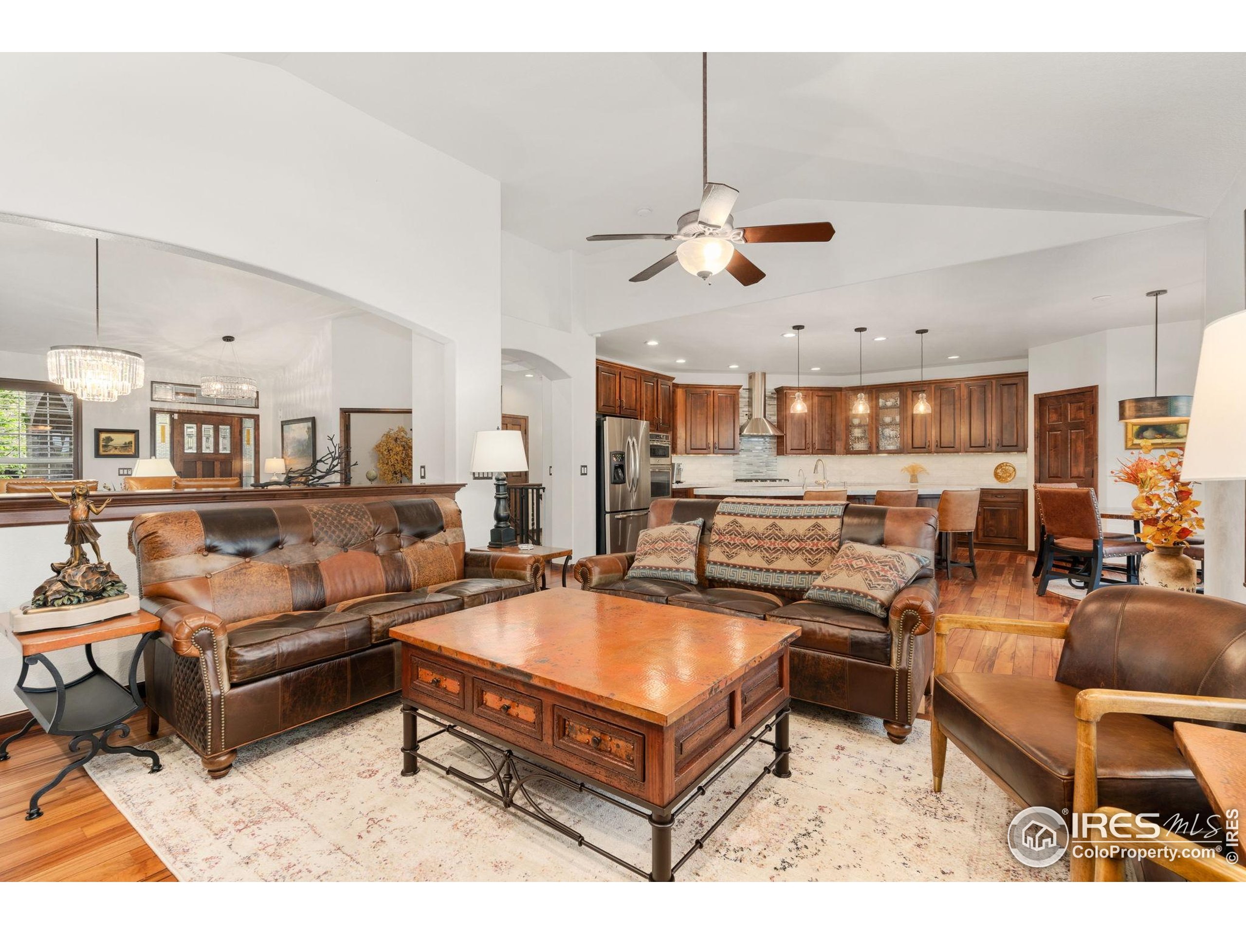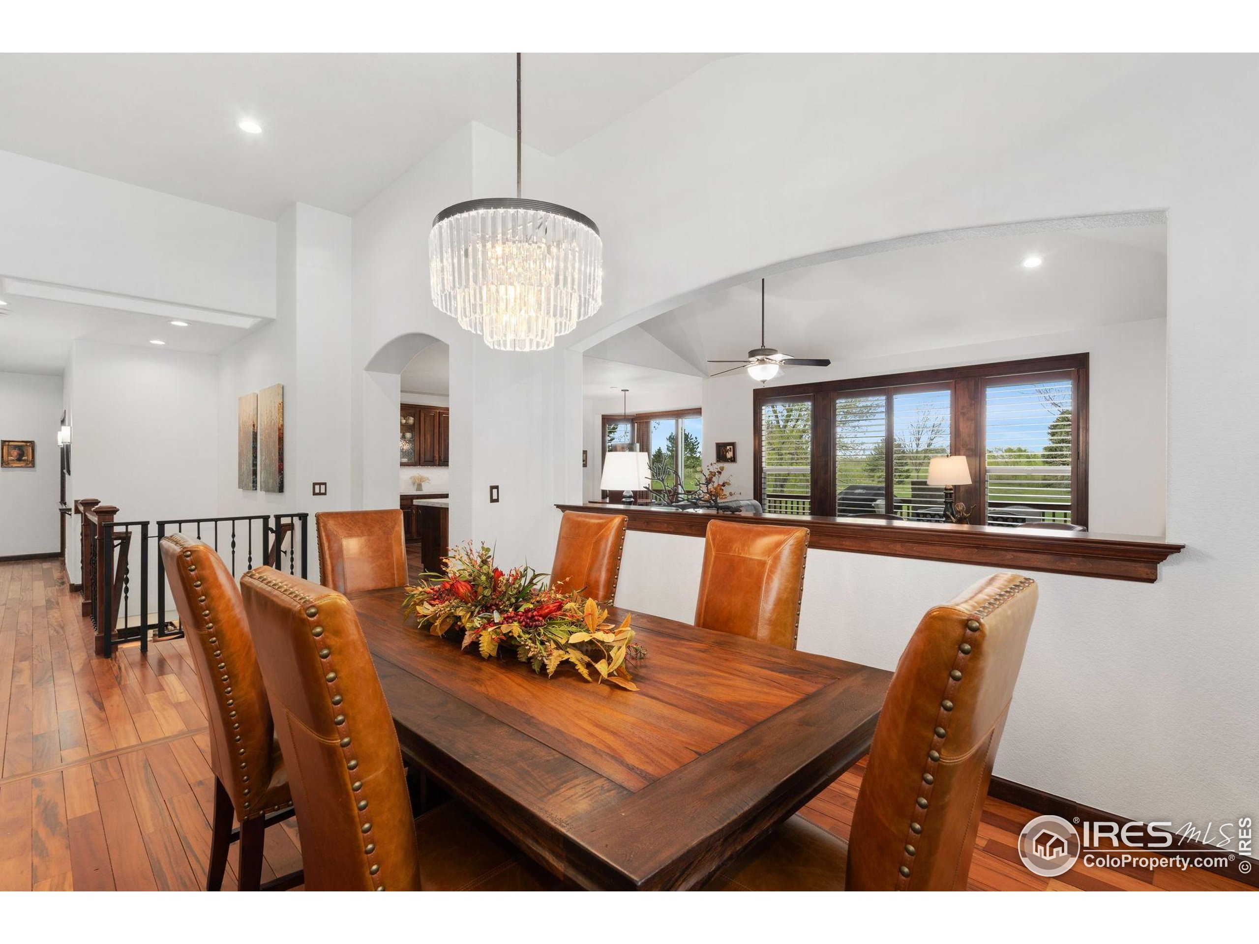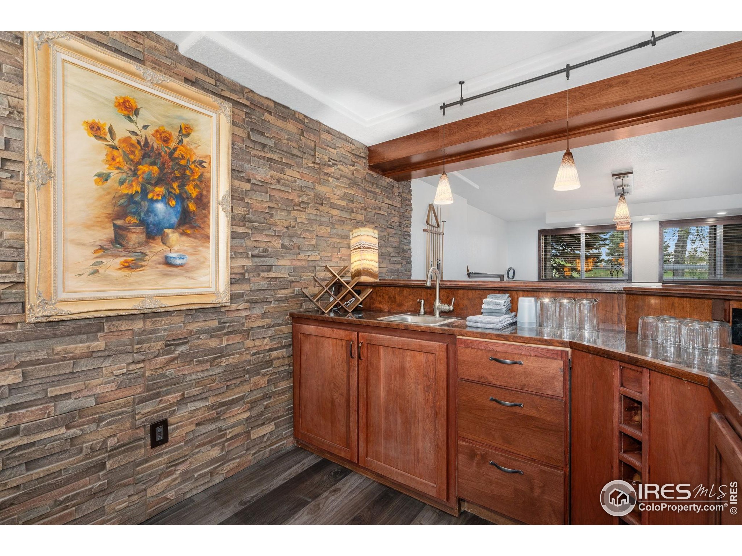 Welcome to 4283 Golf Vista Dr, a stunning and meticulously maintained ranch-style home backing to the 13th Fairway of the Mariana Butte Golf Course. This beautifully appointed 4-bedroom, 3-bathroom residence with a spacious 3-car garage offers the perfect blend of luxury, comfort, and exceptional golf course living. Brazilian tigerwood floors span the main level, complemented by soaring ceilings, custom iron rails, and expansive windows that fill the space with natural light. The home opens to a bright and elegant living room and formal dining room, perfect for entertaining and everyday enjoyment. The chef's kitchen features rich cherry cabinetry, marble countertops, under-cabinet lighting, and a large island with wrap-around seating. It also includes a casual eat-in area for everyday dining and opens directly to the back deck. Adjacent to the kitchen is a cozy family room with a striking leathered granite fireplace-creating a warm and inviting space for relaxation and connection. The expansive primary suite is a serene retreat with sliding doors to the back deck, dual walk-in closets, and a luxurious en-suite bathroom. This spa-like space boasts marble floors, cherry cabinets, a double vanity, a dramatic black tile accent wall, and a walk-in, low profile entry shower. The main floor also includes a second bedroom, an office, a charming 3/4 bathroom, and an updated laundry room with new cabinetry and quartz countertops. The garden-level basement is bright and inviting with tall ceilings, Berber carpet, and plenty of natural light. It features two additional bedrooms, a flex room, a spacious rec room and game room, a second fireplace, and a fully equipped wet bar with refrigerator and built-in wine rack. A private sauna and pool table adds to the home's luxurious amenities. Outside, enjoy beautiful landscaping and peaceful fairway views from the back deck. This is Colorado living at its finest in one of Loveland's most sought-after golf course communities.