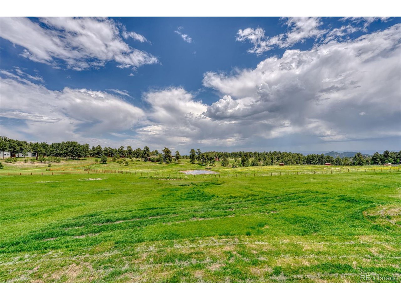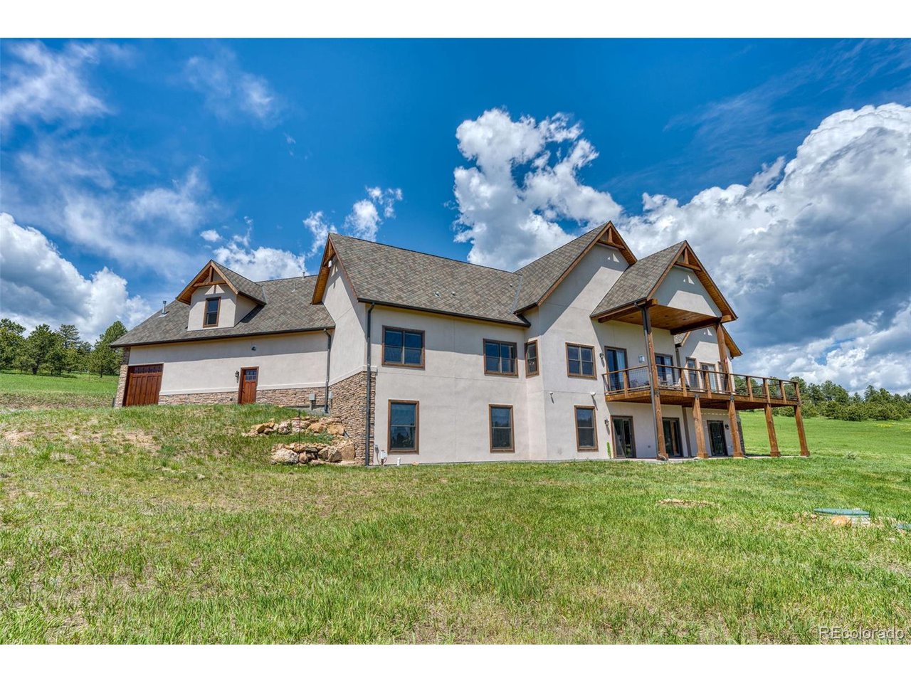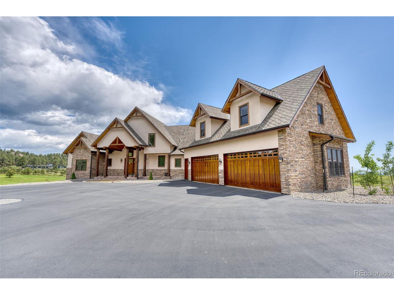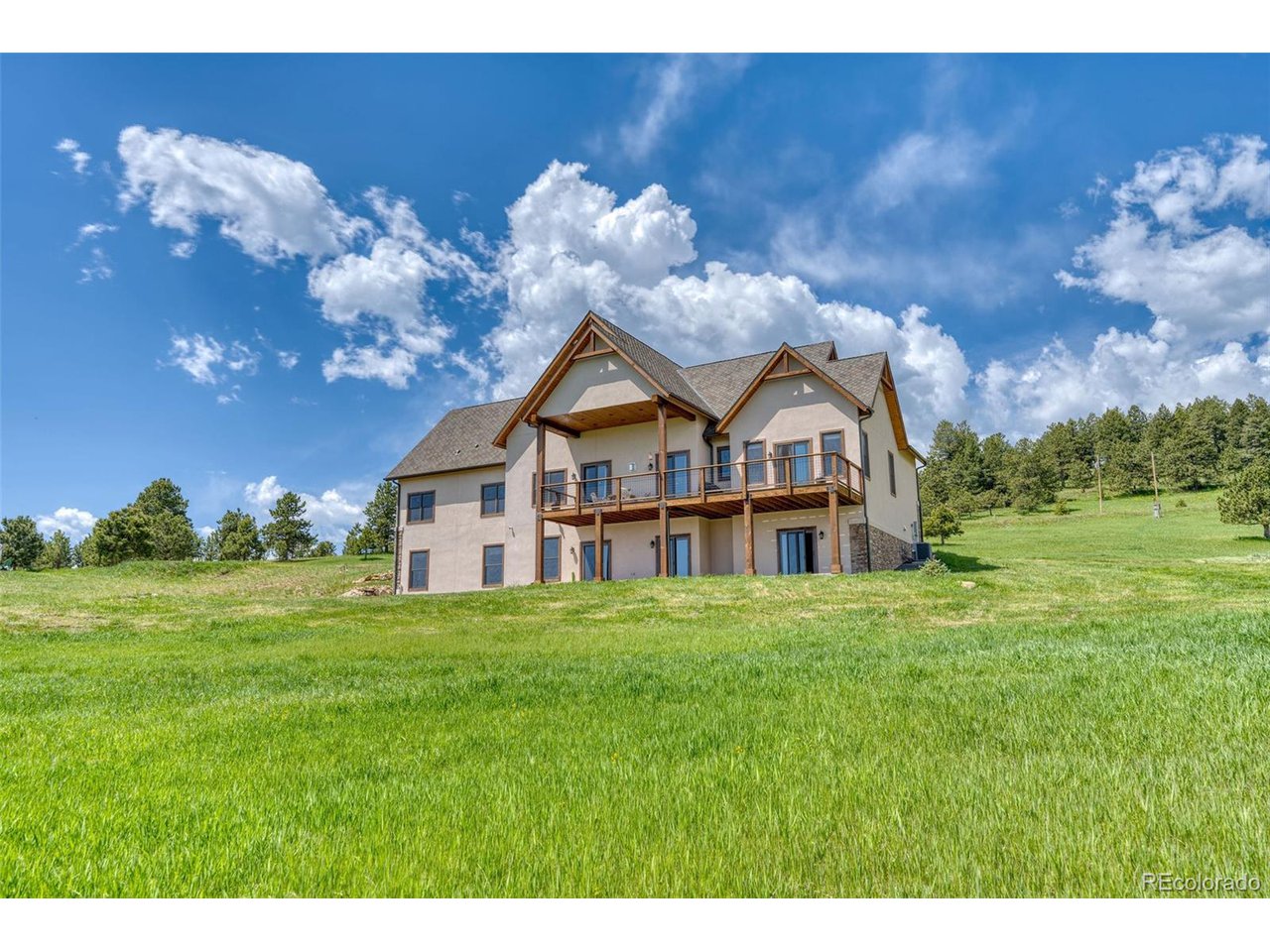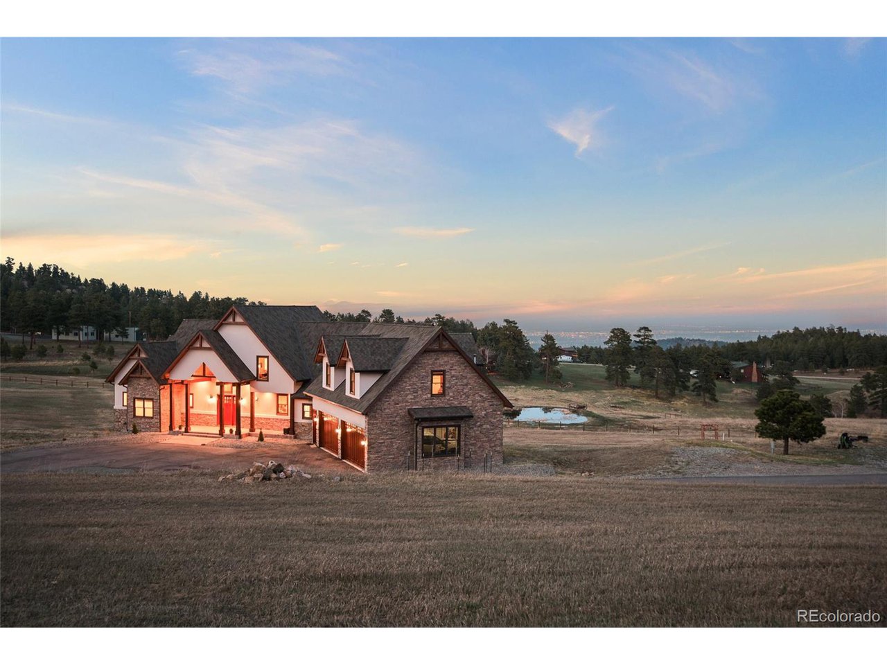 Mountain, meadow and city views. Additional Dwelling Unit or Mother in law suite above garage with private entrance. Situated at 8,200 ft, this home overlooks the twinkly city lights of Denver and surrounding cities in a beautiful mountain meadow which is home to abundant flora and fauna year-round. Built in 2018 by SonPointe Homes Builders, no detail was spared in it's construction. Every room features 10 ft ceilings and doors with molding details which gives the home a true, custom, high quality feel. Kitchen offers a large walk-in custom butlers pantry, custom cabinetry, granite counters and large kitchen island, great for entertaining guests or accommodating large gatherings. Vaulted ceilings in the spacious living area with stunning views of mountains, city and quaint neighboring pond. Large deck with plenty of room for your own personal touches. Windows are doors were all done using Sierra Pacific windows and doors with Low E glass. Step into your own private oasis with the primary suites vaulted ceilings, his and hers walk-in closets with custom organization, large soaking tub, dual sinks, and heated multi-head shower with detailed custom tile. Floors in all six bathrooms have programable heat thermostats. Tankless water heater, 120,000 btu propane furnace with 3.5T air conditioner. Enjoy the 35 foot deep 4 car heated garage for your cars and toys with an additional 50' RV pedestal with full 50A service, water and waste dump, 50 x 100 pad. Above the garage is an 950 sqft ADU with kitchenette, dining area, custom shelving, and cozy pellet stove. This flex space would be excellent for a mother in-law suite, guest house, office with private entrance. Every bedroom has it's own bathroom with plenty of closet space. Loft above living area includes cat walk with seating area and/or library. Upstairs bedroom would be great for another private office or crafting room with a huge walk-in closet and full bathroom. Huge unfinished walk-out basement.