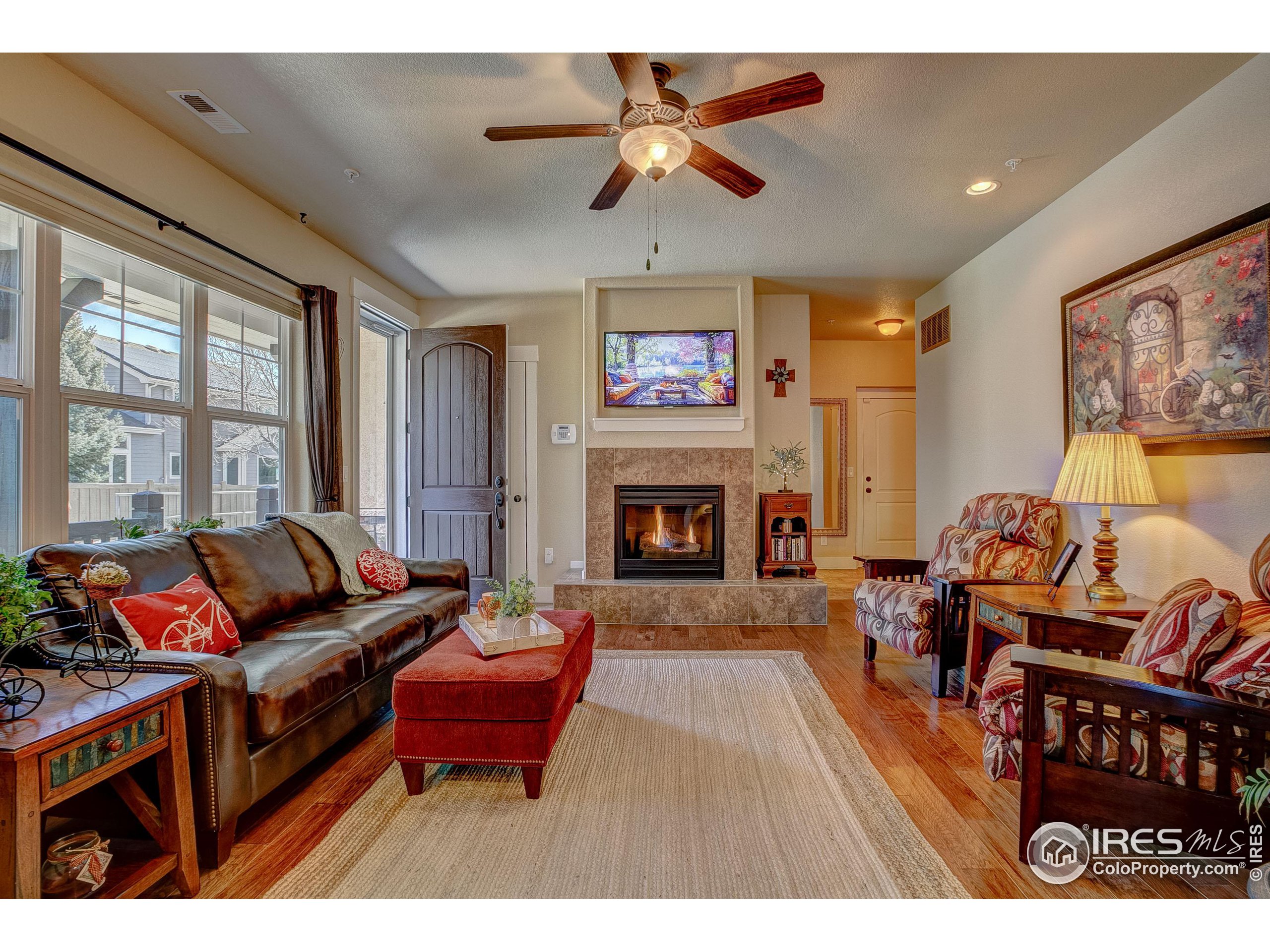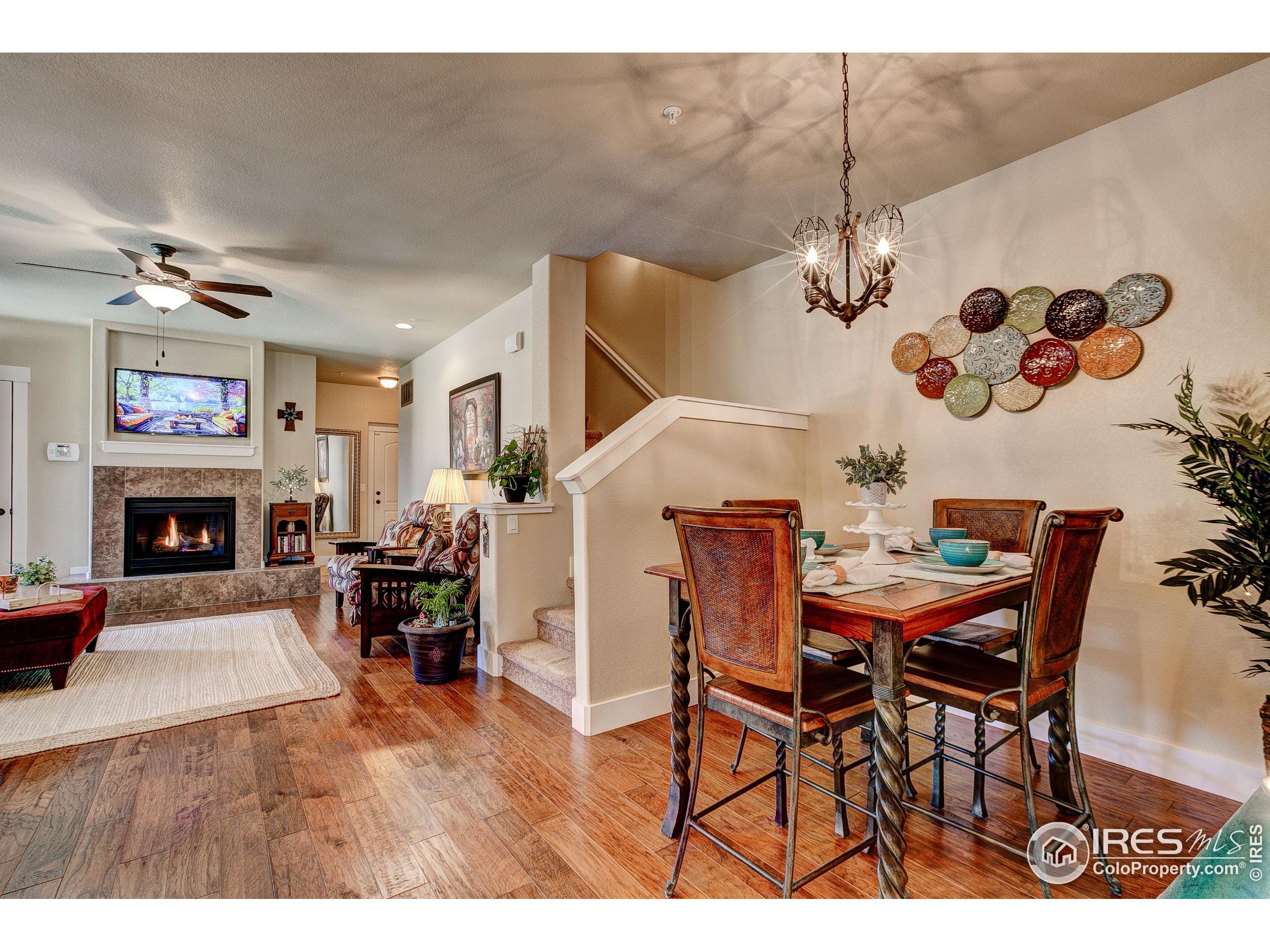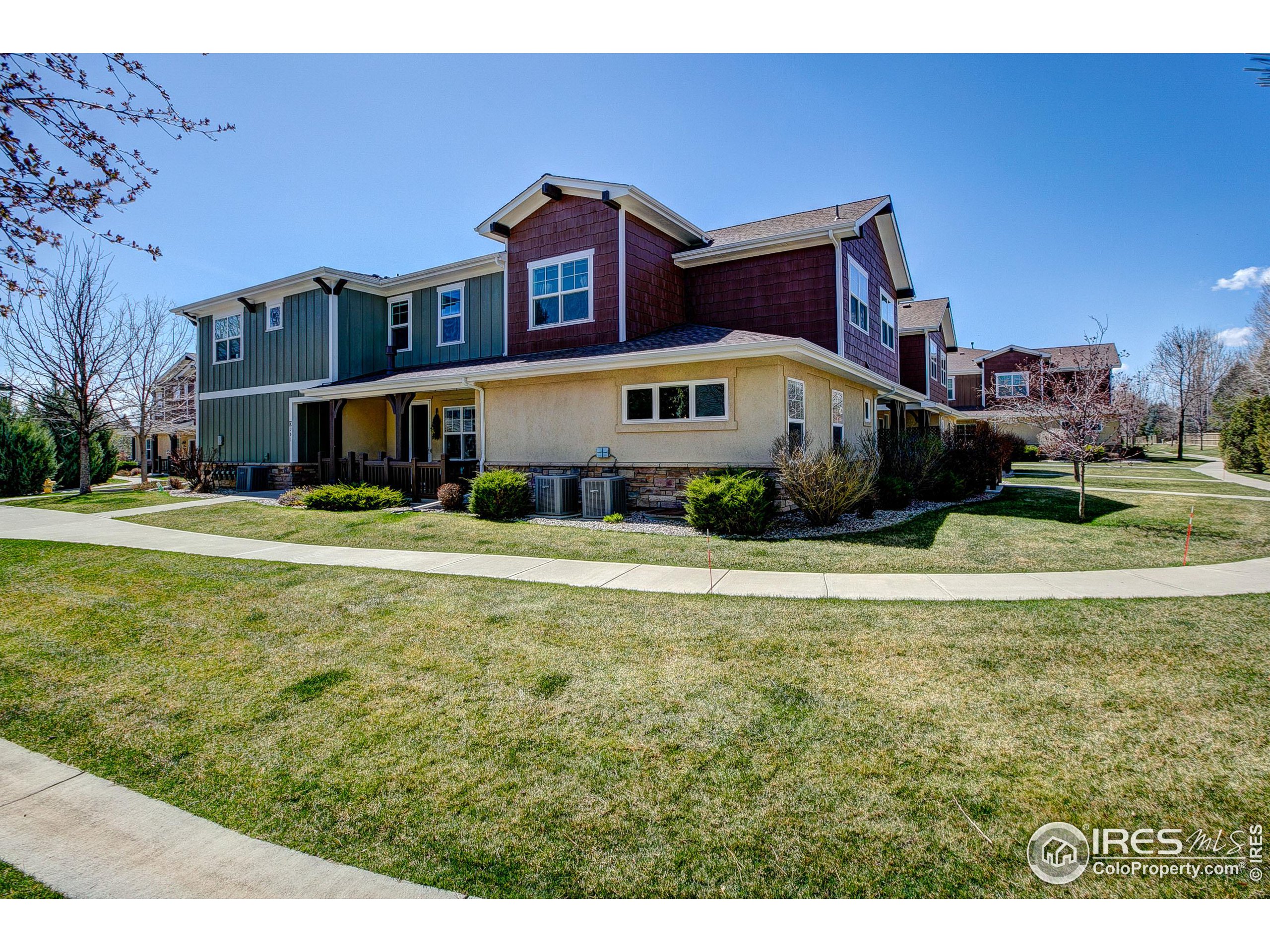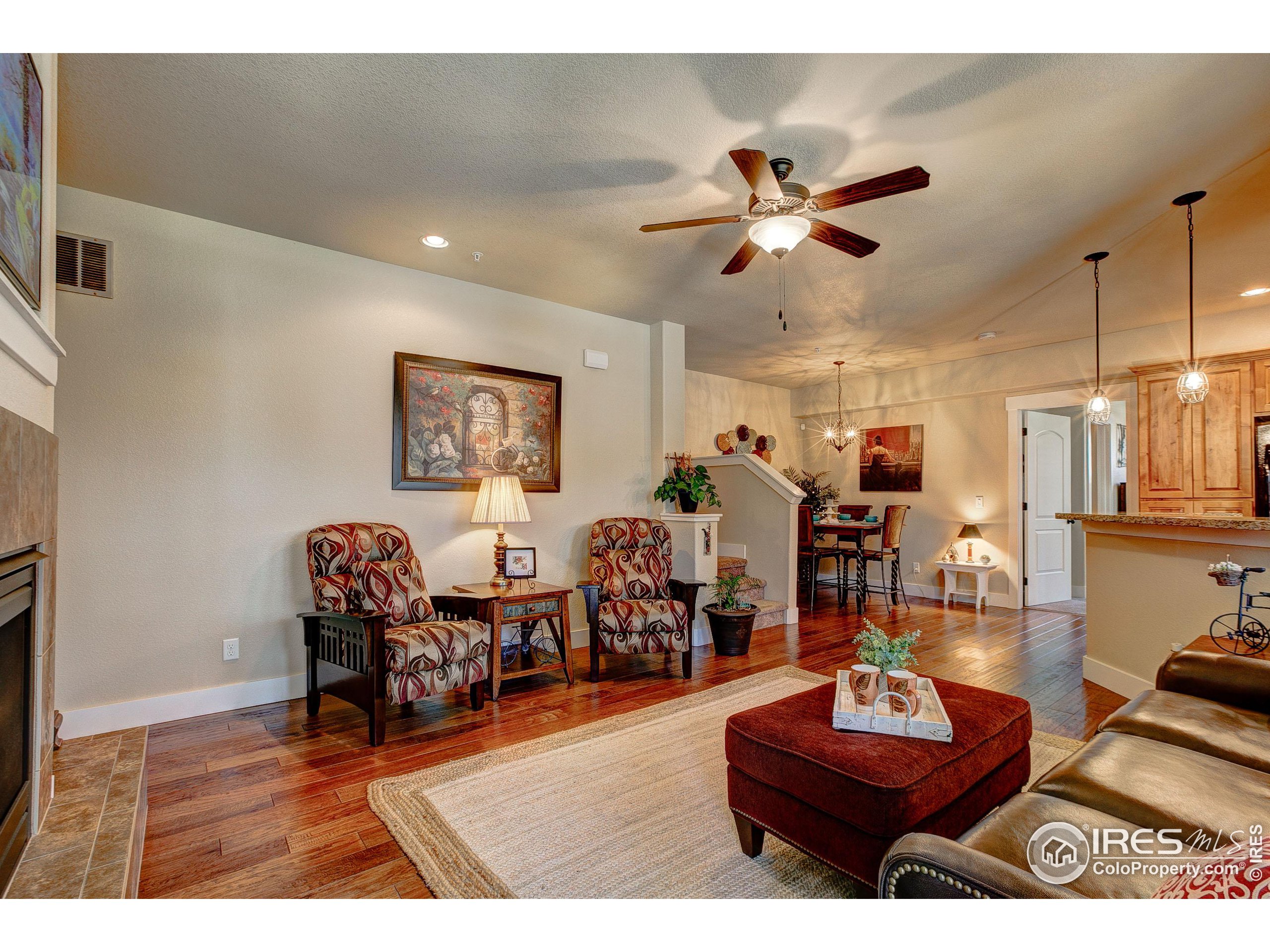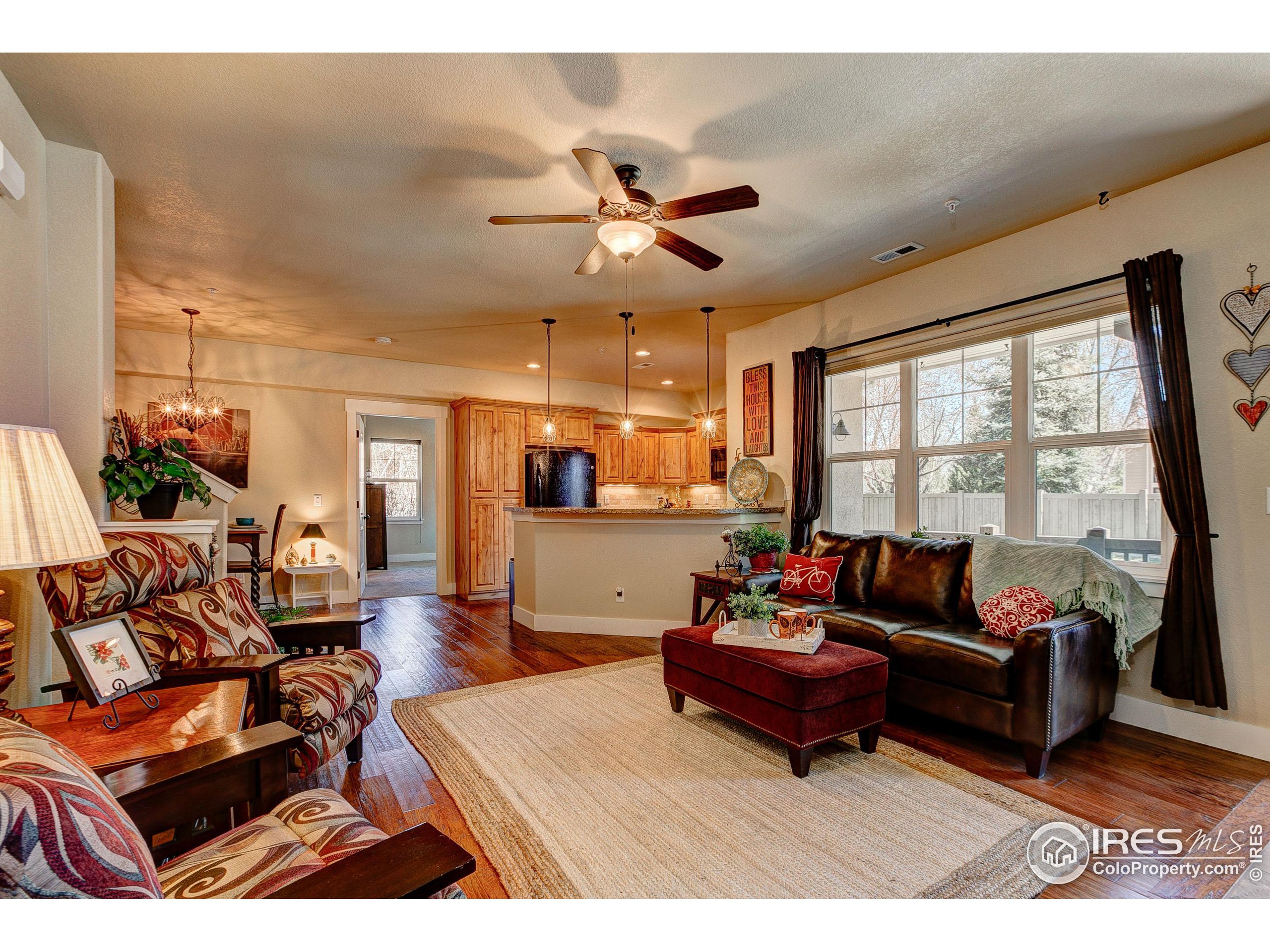 Exquisite! Impeccably maintained, luxury condo in one of SE Ft. Collins' most prestigious neighborhoods! Quality built and loaded with upgraded features, located in the most desired location within the development. Tucked away for privacy with large grassy area and mature landscaping. This lovely condo boasts main level living with access front and back without stairs! Stunning hardwood floors throughout the kitchen, living and dining areas as well as the upstairs loft, hallway and craft room! The kitchen features "city scape" cabinets, granite counters, full stone back splash, under cabinet lighting, Copper sink, double oven and access door to the patio. The 2 car garage has direct access to the living space without out stairs. The large laundry/mud room area can be used as a pocket office or craft area. Check out the size of main level powder bath! Storage cabinet and granite counter. The main level primary is full of natural light with multiple windows, coffered ceiling and ceiling fan. The attached primary bath has an elevated, 2 sink cabinet, walk-in shower w/bench and 2 shower heads and attached closet. Upstairs has a loft area, 2 large bedrooms with Jack and Jill bath between. The bathroom has a linen closet, 2 medicine cabinets and a separate room for tub/shower and toilet. The basement is completely finished by the builder as a HUGE living space! There is a rough-in for an additional bath at the bottom of the stairway. The large egress windows allow for 2 additional bedrooms if desired. The furnace is newer and radon mitigation is installed. No pets have ever lived in this pristine home. Perfect for your lock and leave lifestyle, or plenty of room for the kids with quick access to schools. Pool membership is optional.
